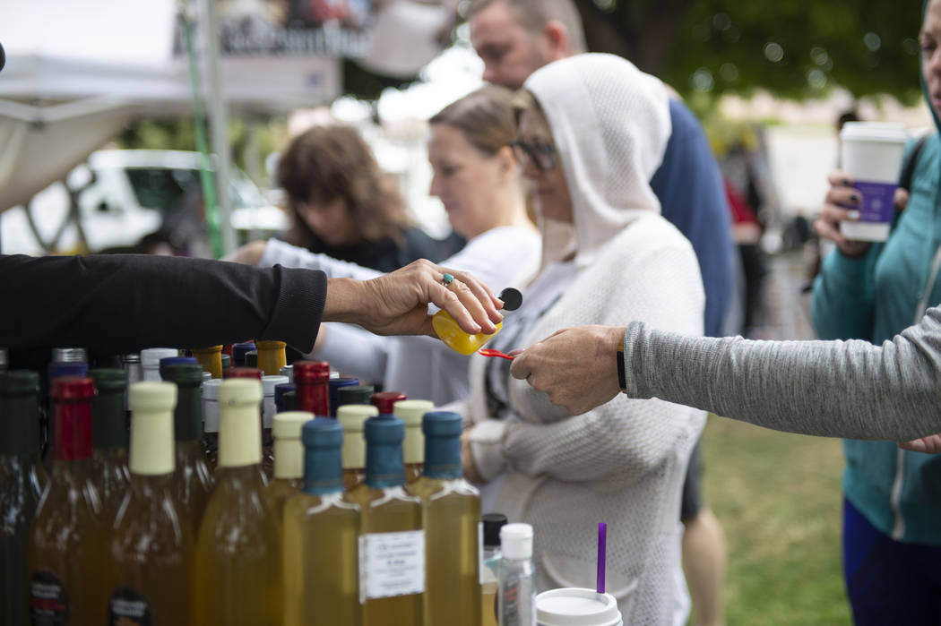 Ethel Klimes of Ukiah, California hands a sample of one of the products for sale at the California Balsamic tent to Wendy Kruum of Boulder City at the annual Art in the Park event in Boulder City, Sunday, Oct. 7, 2018. Caroline Brehman/Las Vegas Review-Journal @carolinebrehman