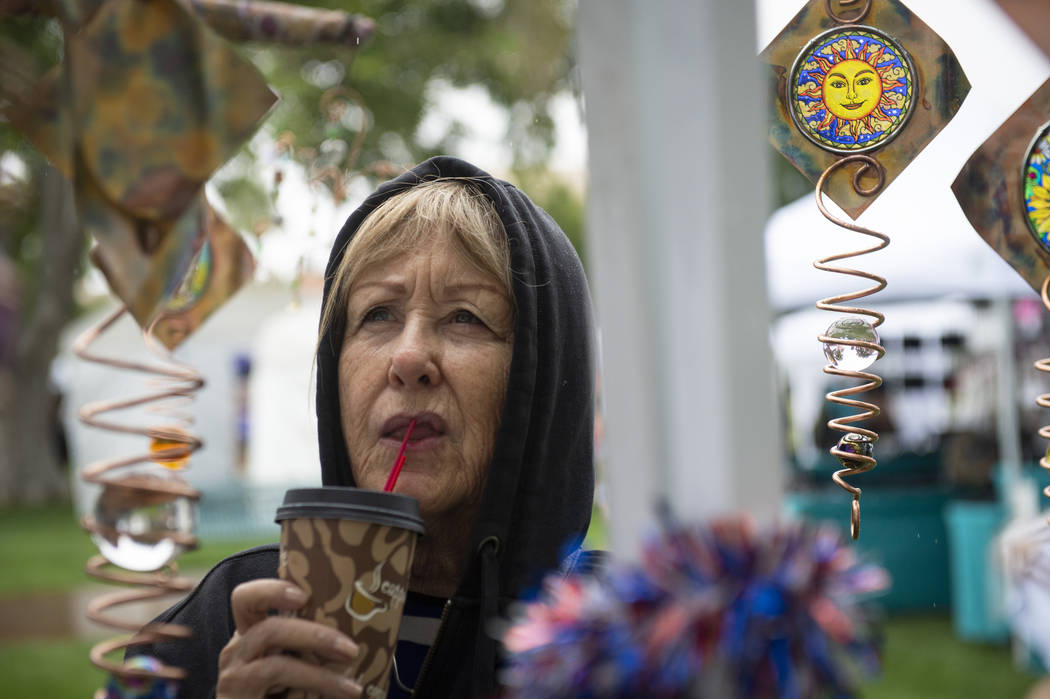 Jeanne Wadsworth of Las Vegas looks at the artworks being sold at the Brighten Your Life Creations tent, a business from Oxnard, California, at the annual Art in the Park event in Boulder City, Sunday, Oct. 7, 2018. Caroline Brehman/Las Vegas Review-Journal @carolinebrehman