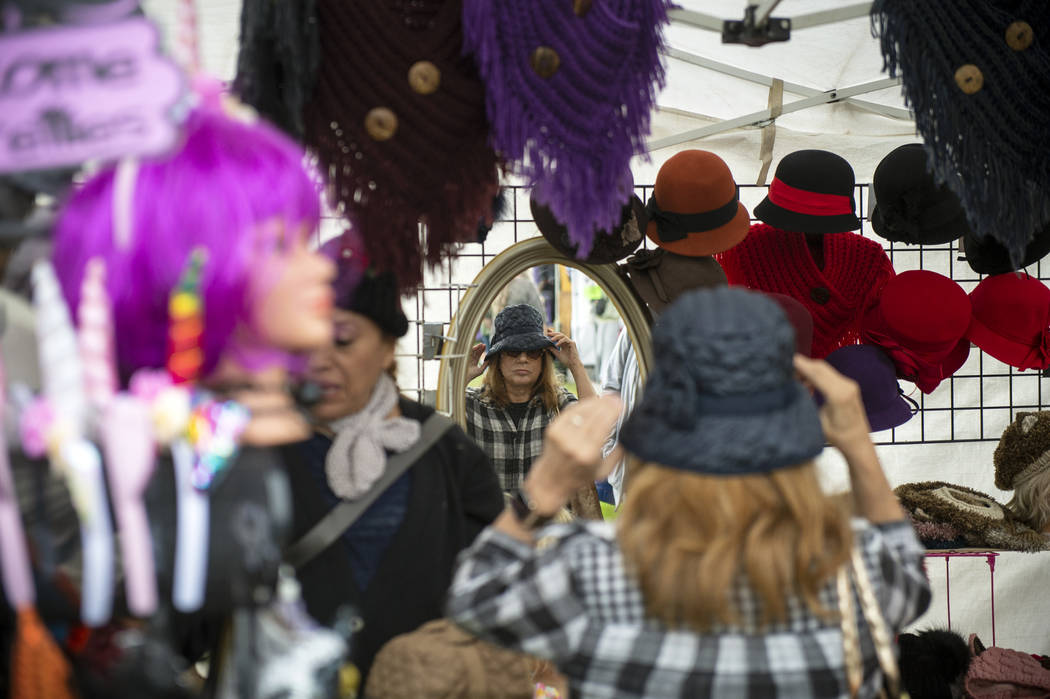 Meryl Reyman of Henderson looks in the mirror as she tries on a hat at the Martha’s Special T’s tent, a business from Los Angeles, at the annual Art in the Park event in Boulder City, Sunday, Oct. 7, 2018. Caroline Brehman/Las Vegas Review-Journal @carolinebrehman