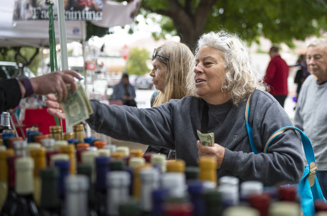Nancy Dineen of Huntington Beach, California hands money to Arlene Harris, an owner at California Balsamic, as she buys one of the items for sale at the California Balsamic tent at the annual Art in the Park event in Boulder City, Sunday, Oct. 7, 2018. Caroline Brehman/Las Vegas Review-Journal @carolinebrehman