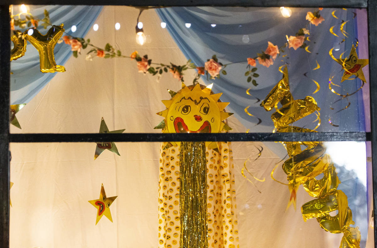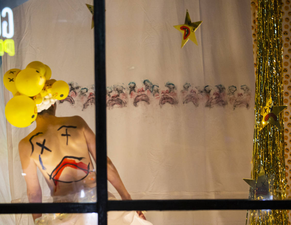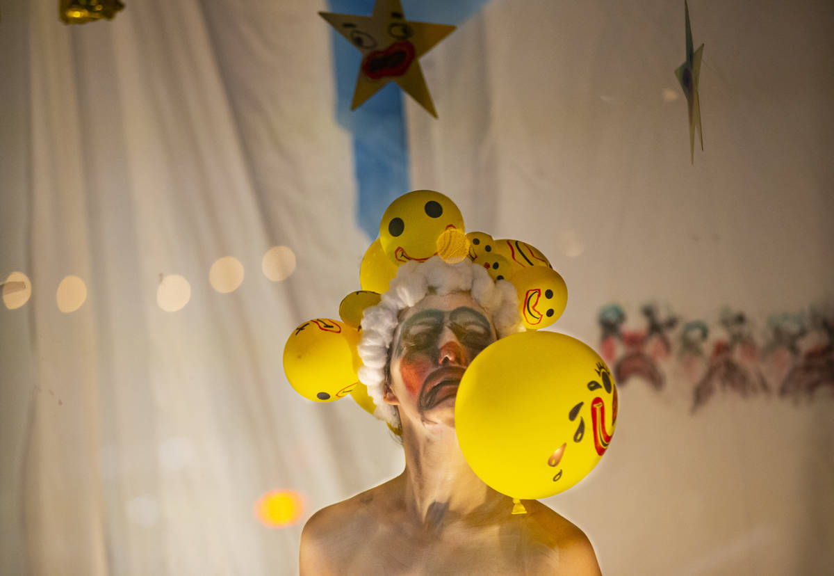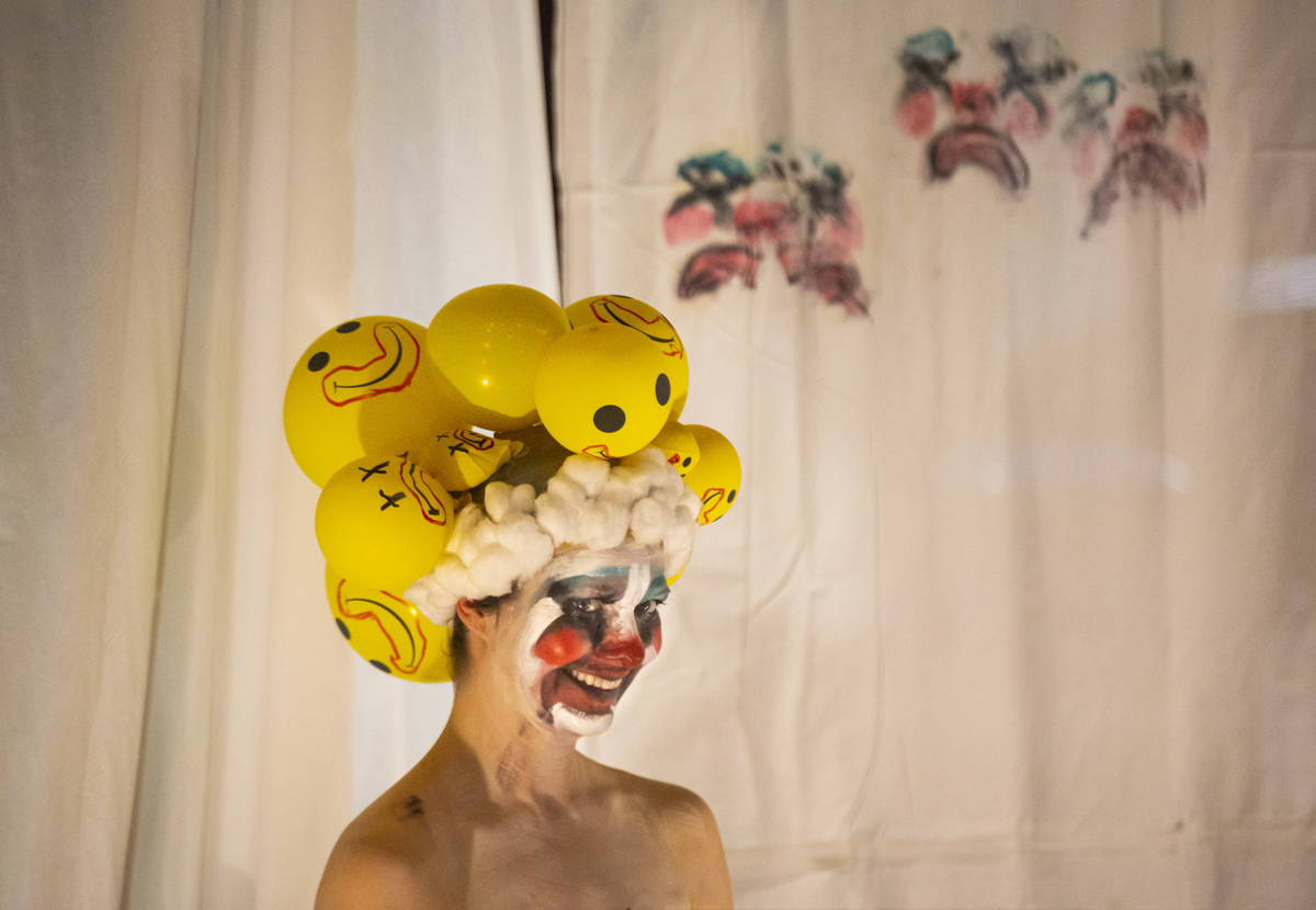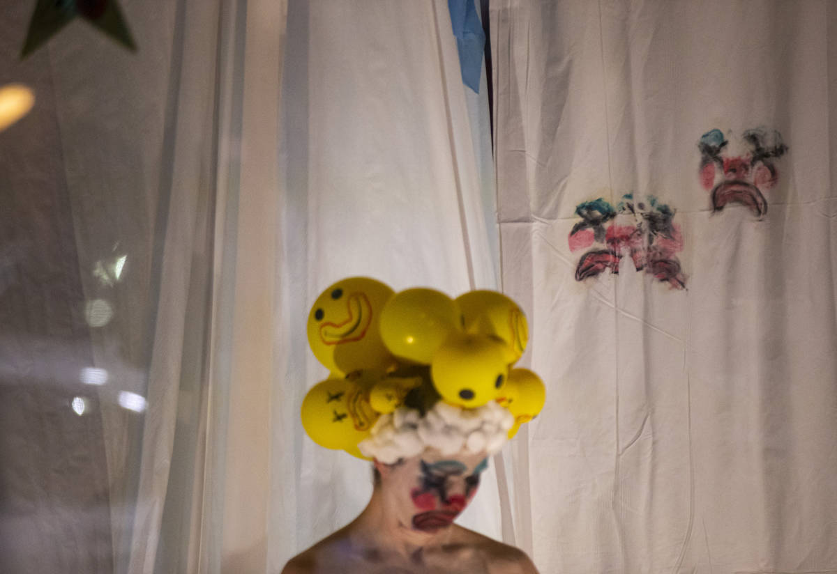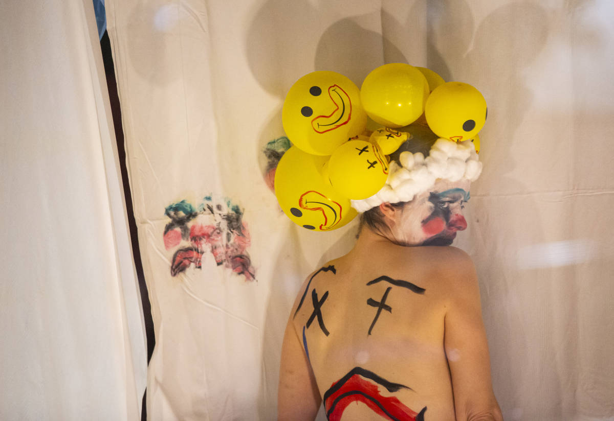 Rider sat poised behind a small mirror. Her hair was concealed beneath a headdress of yellow smiling balloons. Her torso was made up with body paint with two eyes over her chest and a wide frown over her abdomen, above the waistline of a full tulle skirt.