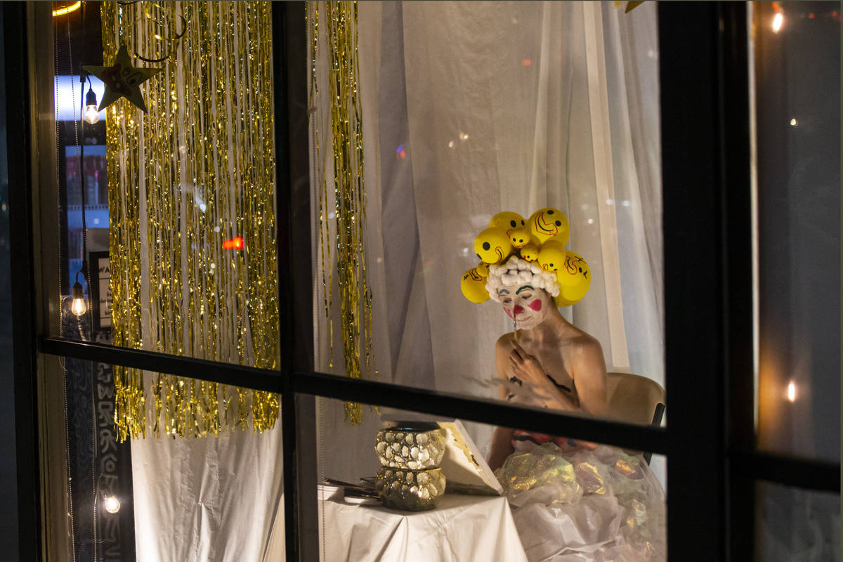 Due to COVID safety restrictions, she devised a physical barrier between herself and the fluctuating audience by sitting behind the theater’s window.