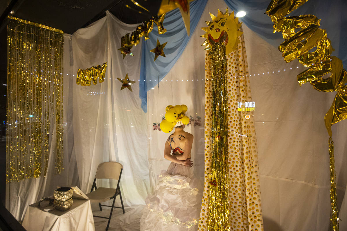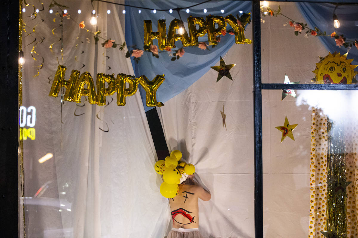 While Rider painted and wiped and painted and wiped her face over four hours between the two sittings, some passersby approached the window to wave or muse over Rider’s intention or point to the balloon banner above Rider that read “HAPPY” and encourage her to smile.