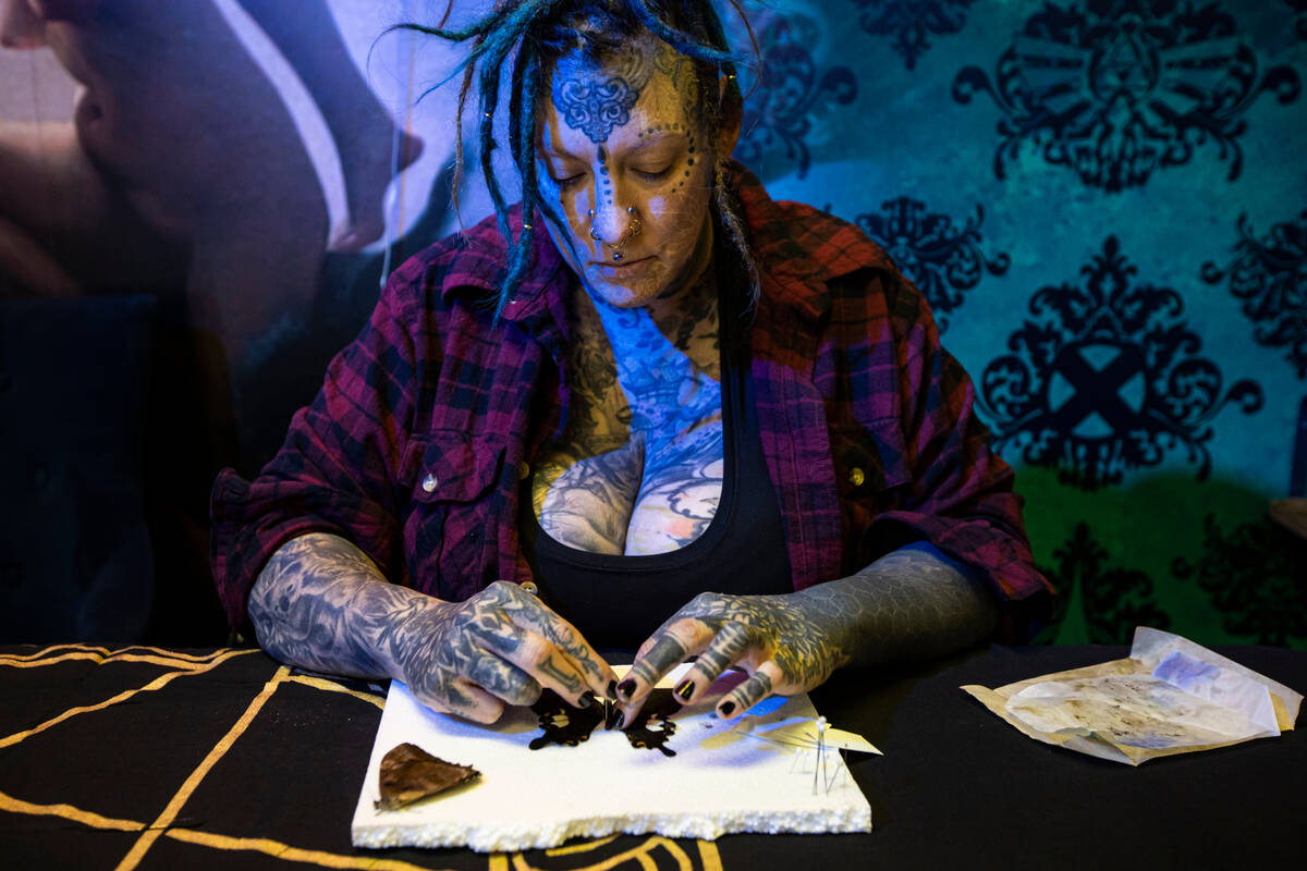 Covered from forehead-to-foot in tattoos, hair tinged with blue, Kmit’s as colorful in both appearance and vocabulary as the deceased bugs she presents to the three women seated around her, arms resting on a tie-dyed, pentagram-adorned tablecloth.