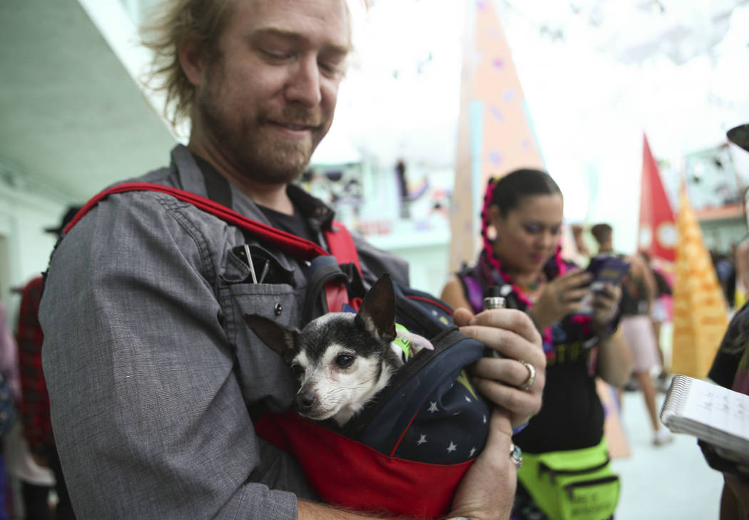 Like her owner’s psychedelic leggings among the sea of costumes, face paint and neon clothing, the 15-year-old Chihuahua nestled in his mesh Wonder Woman bag looked right at home.