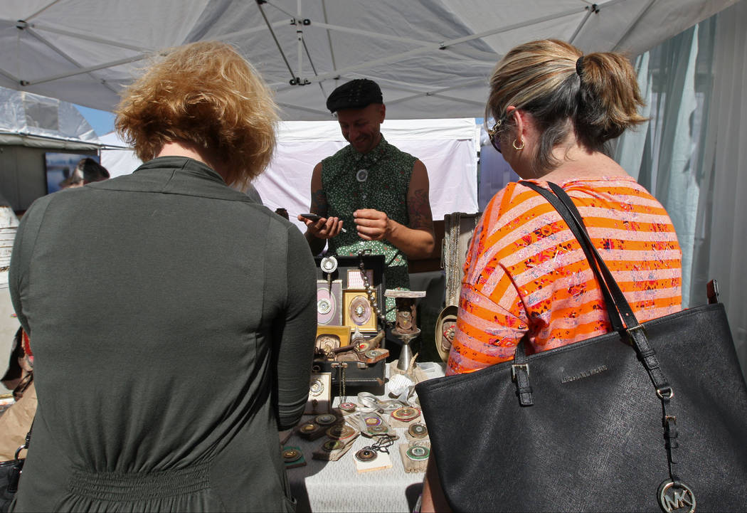 Robin Ion, left, and Carolyn Willis decide which jewelry to buy from Somniative's stall at the Summerlin Festival of Art at The Lawn at Downtown Summerlin in Las Vegas, Saturday, Oct. 14, 2017. Gabriella Benavidez Las Vegas Review-Journal @latina_ish
