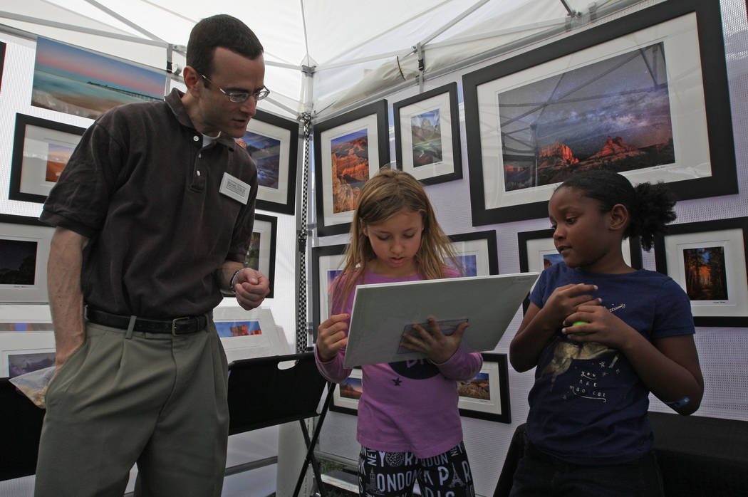 Michael Tessler, left, explains how he takes photos to Gianna Kelley, 8, and Nariah Higgins, 8, during the Summerlin Festival of Art at The Lawn at Downtown Summerlin in Las Vegas, Saturday, Oct. 14, 2017. Gabriella Benavidez Las Vegas Review-Journal @latina_ish