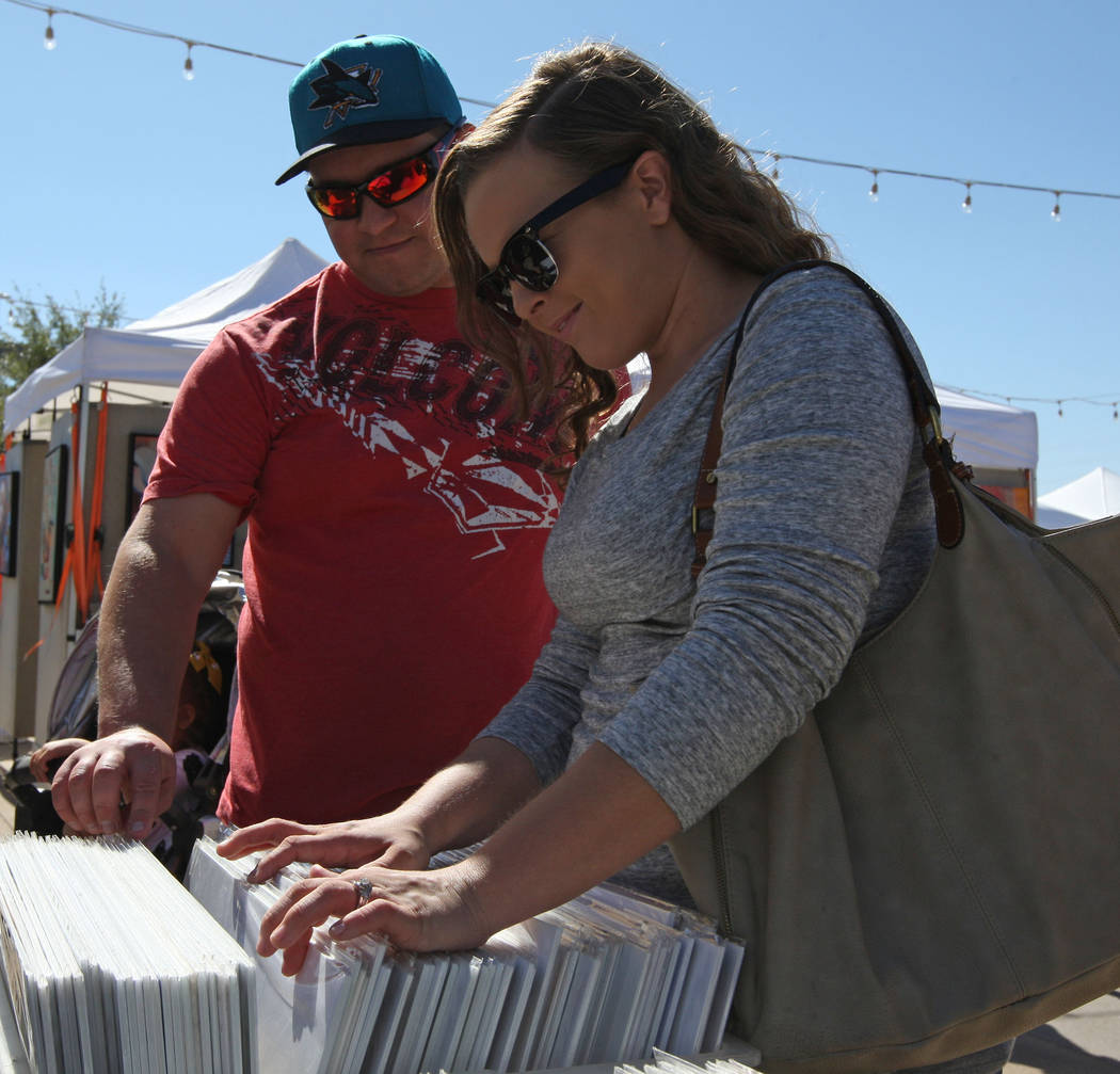 Tommy Franich, left, and Lauren Franich look through photo prints on sale during the Summerlin Festival of Art at The Lawn at Downtown Summerlin in Las Vegas, Saturday, Oct. 14, 2017. Gabriella Benavidez Las Vegas Review-Journal @latina_ish