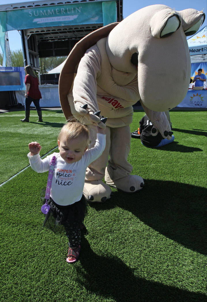 One-year-old Ruby Larcen leads Mojave Max on a walk during the Summerlin Festival of Art at The Lawn at Downtown Summerlin in Las Vegas, Saturday, Oct. 14, 2017. Gabriella Benavidez Las Vegas Review-Journal @latina_ish
