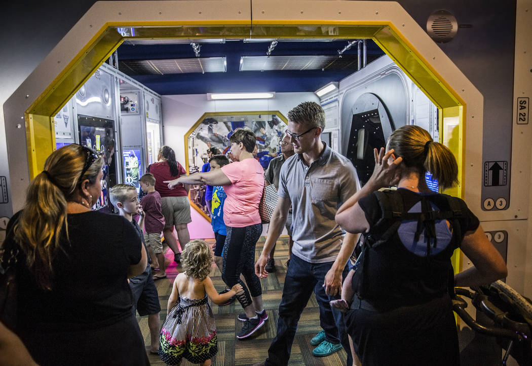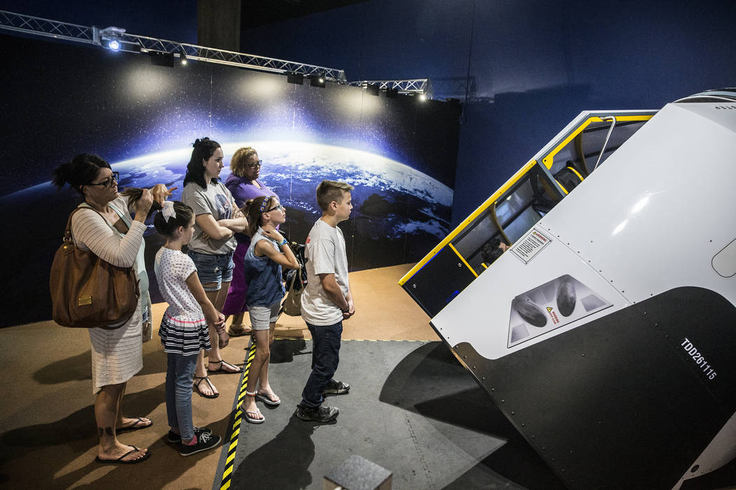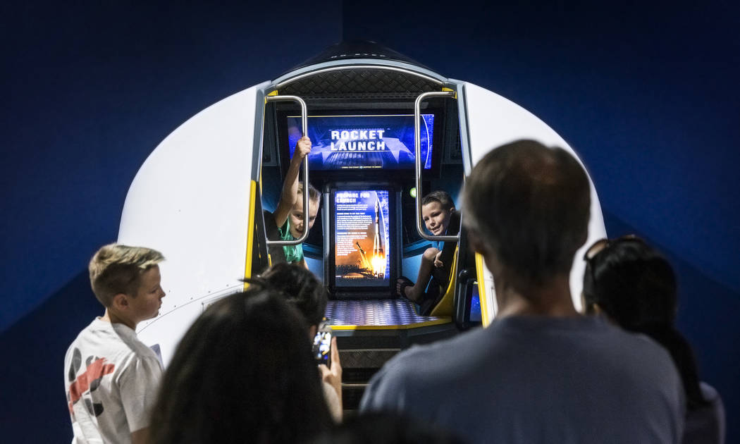 The exhibit launches — literally — with a simulated blast-off that leaves passengers shaking in their bucket seats. For an even bigger motion-sickness challenge, there’s always the self-propelled G-force centrifuge capsule.
