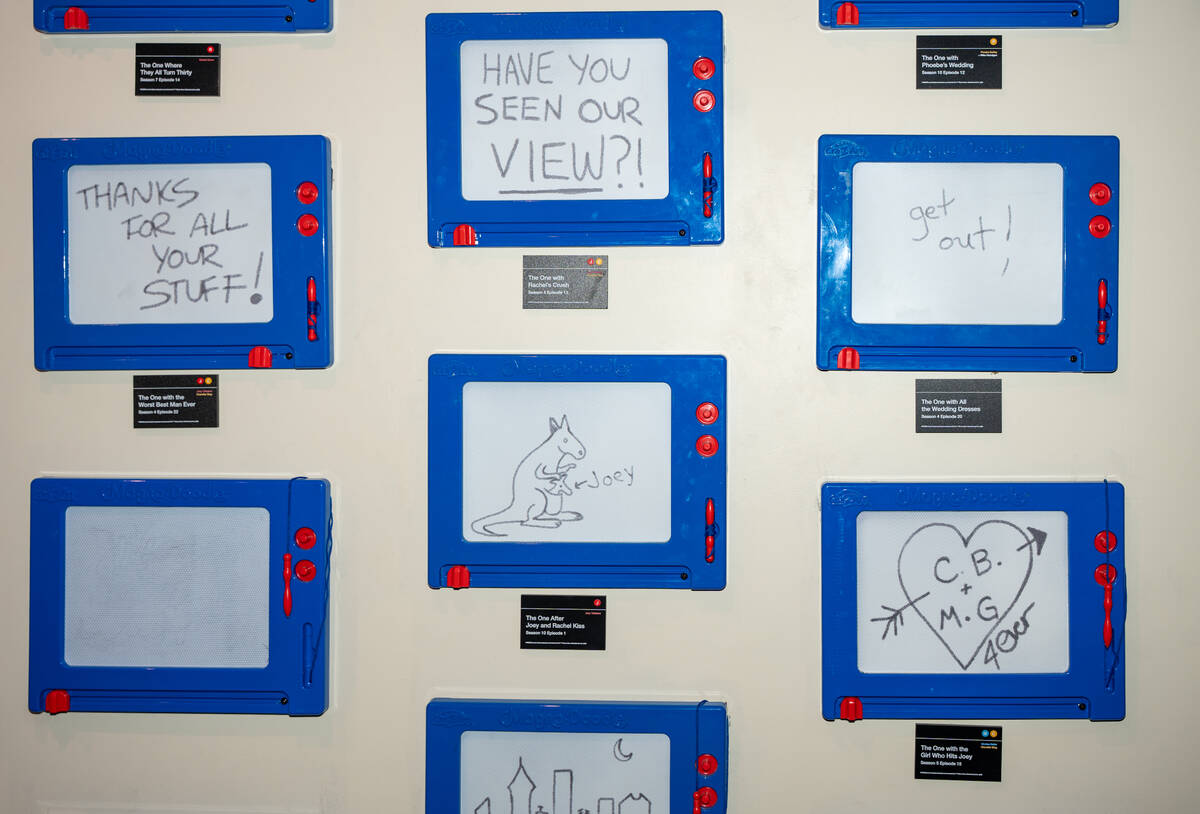 Some pieces come with signs explaining their significance. Take Pat the Dog, Joey’s beloved greyhound statue, or the collection of Magna Doodles displaying some of the favorite sayings from the toy on the back of Chandler and Joey’s door.