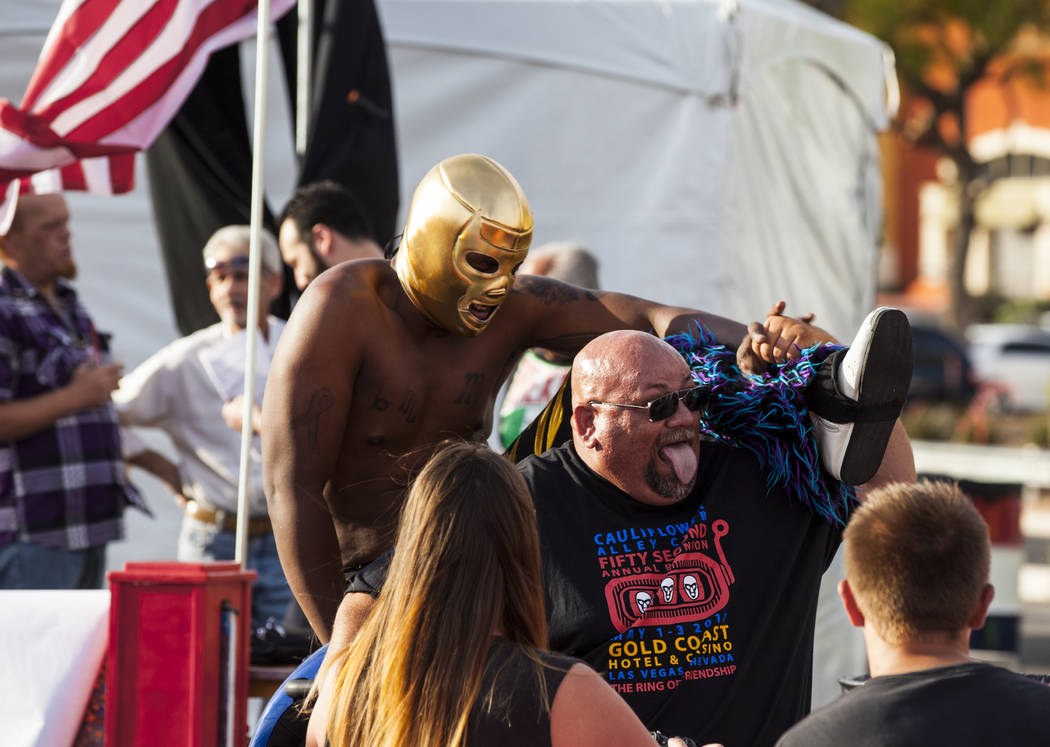 Mike Ross takes a photo with luchador Nacho Negro during the El Tiempo block party at Texas Station hotel-casino in North Las Vegas on Friday, May 5, 2017. Miranda Alam Las Vegas Review-Journal @miranda_alam