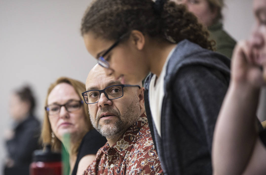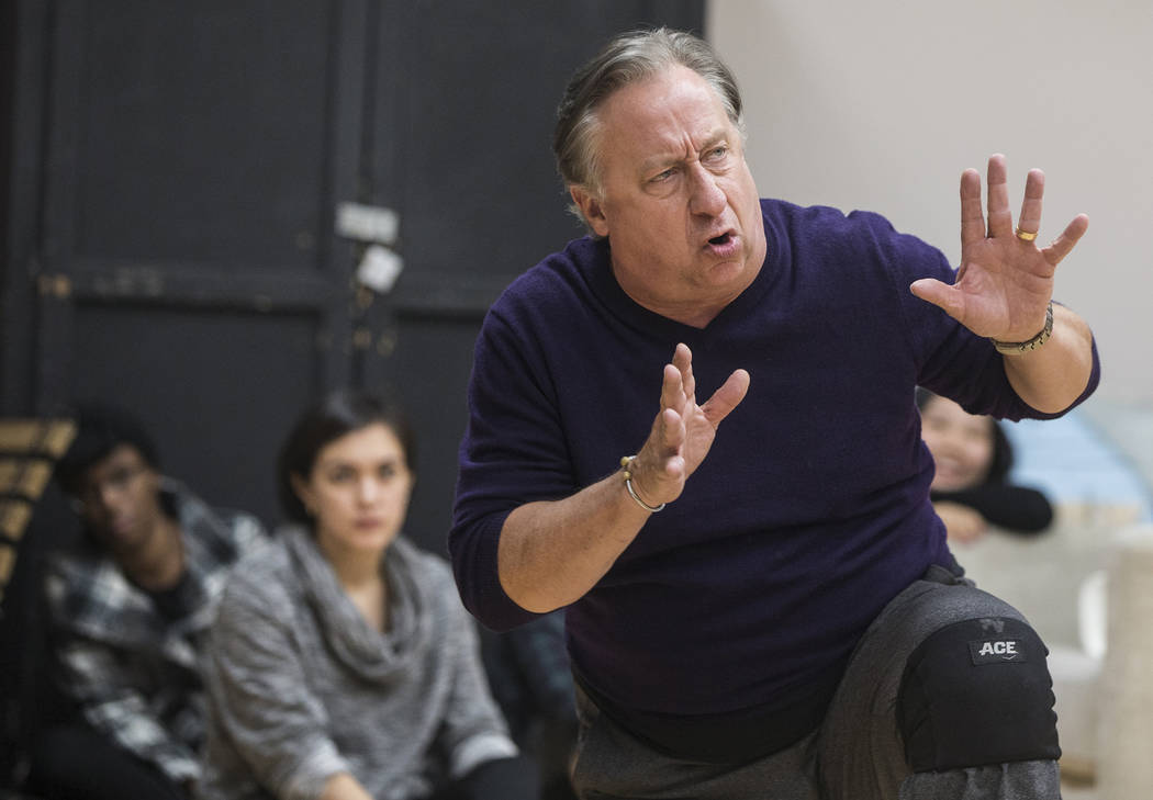 Director Christopher Edwards, right, leads rehearsal of the Nevada Conservatory Theatre’s “A Christmas Carol,” offering a contemporary twist on the original Charles Dickens’ Victorian-era tale on Tuesday, Nov. 14, 2017, at the Alta Ham Fine Arts Building, at UNLV, in Las Vegas. Benjamin Hager Las Vegas Review-Journal @benjaminhphoto