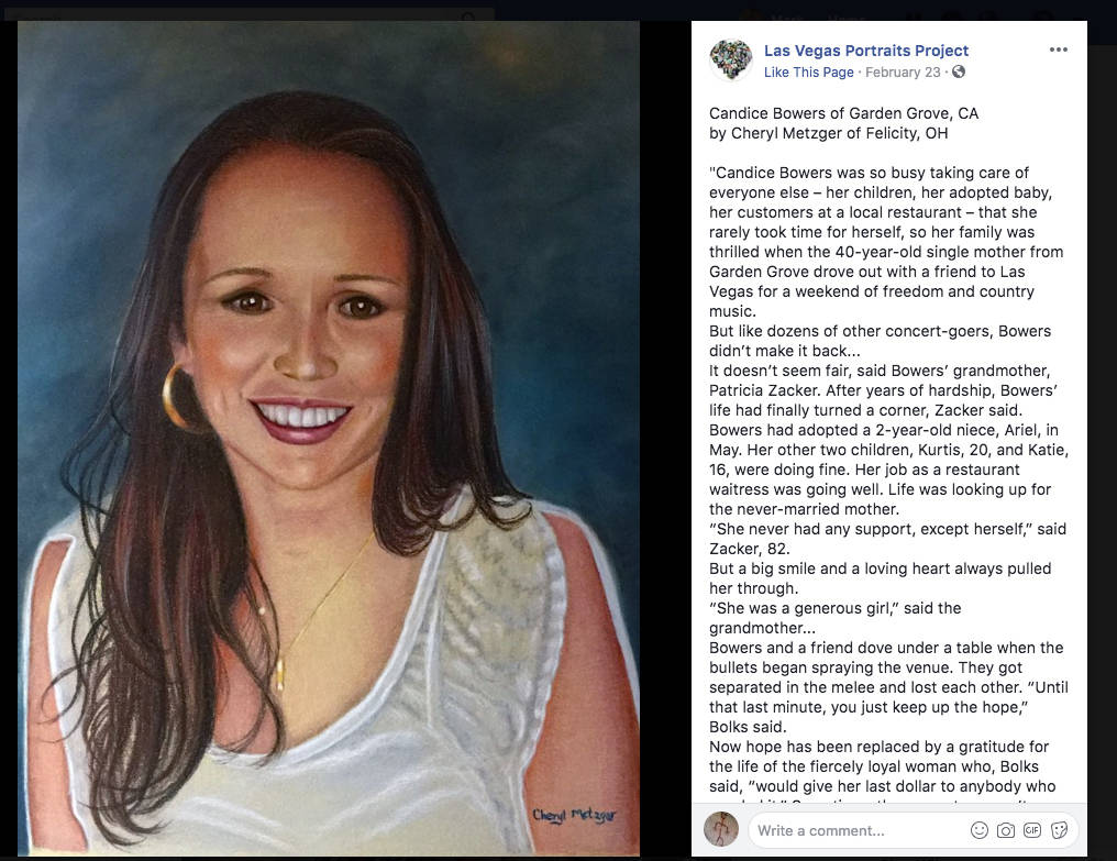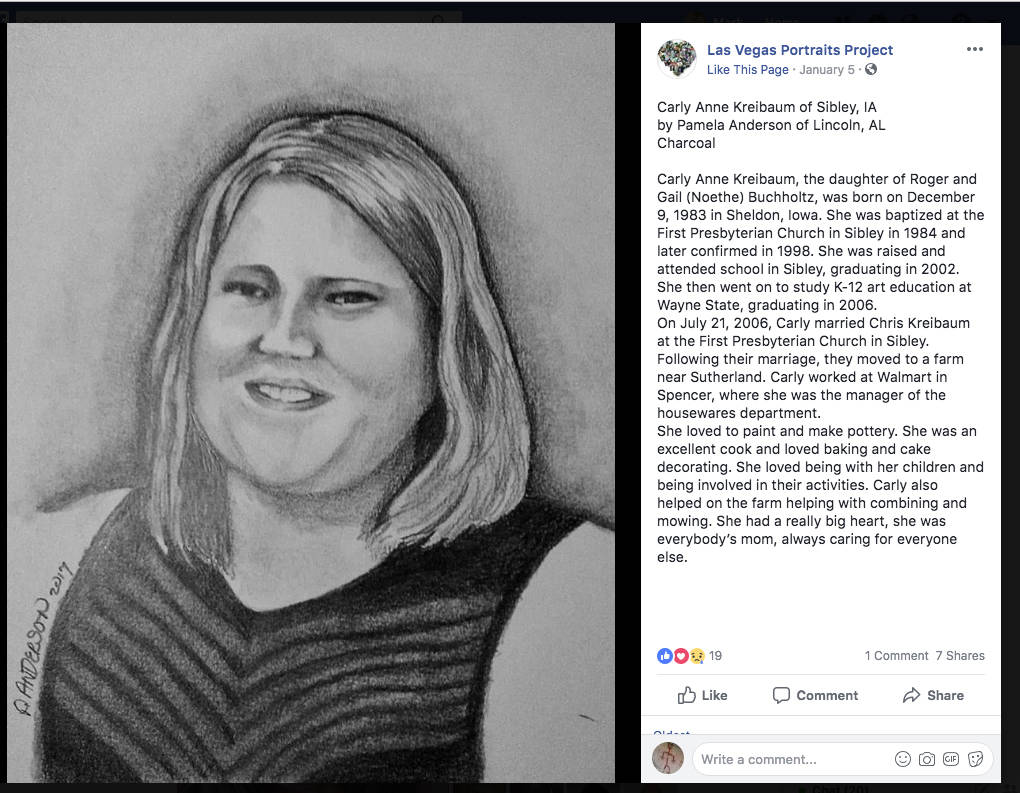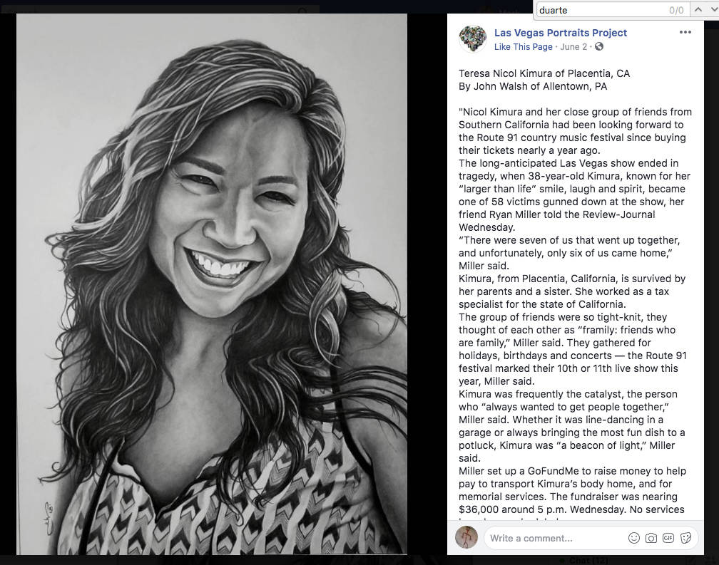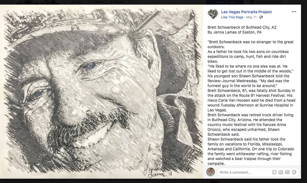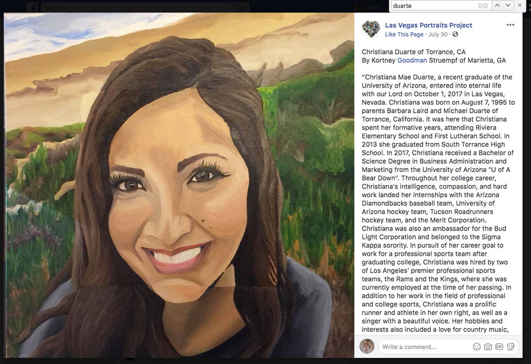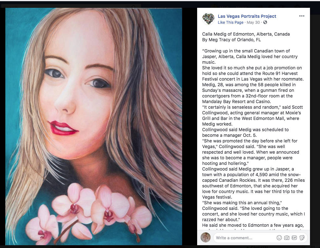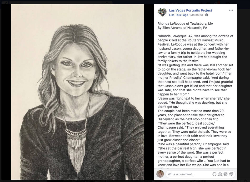 The portrait project was organized by Kortney Struempf of Georgia and Ellen Abramo of Pennsylvania, cousins and artists who participated in a similar project to honor victims of the June 2016 Pulse nightclub shooting in Orlando . Struempf said that when she and Abramo learned of the Oct. 1 shooting, they immediately felt moved.
