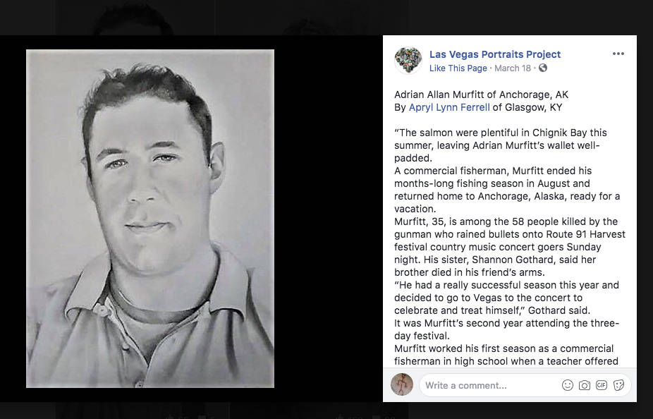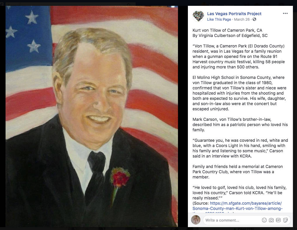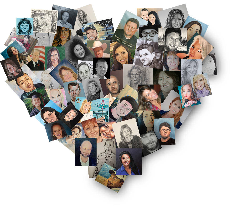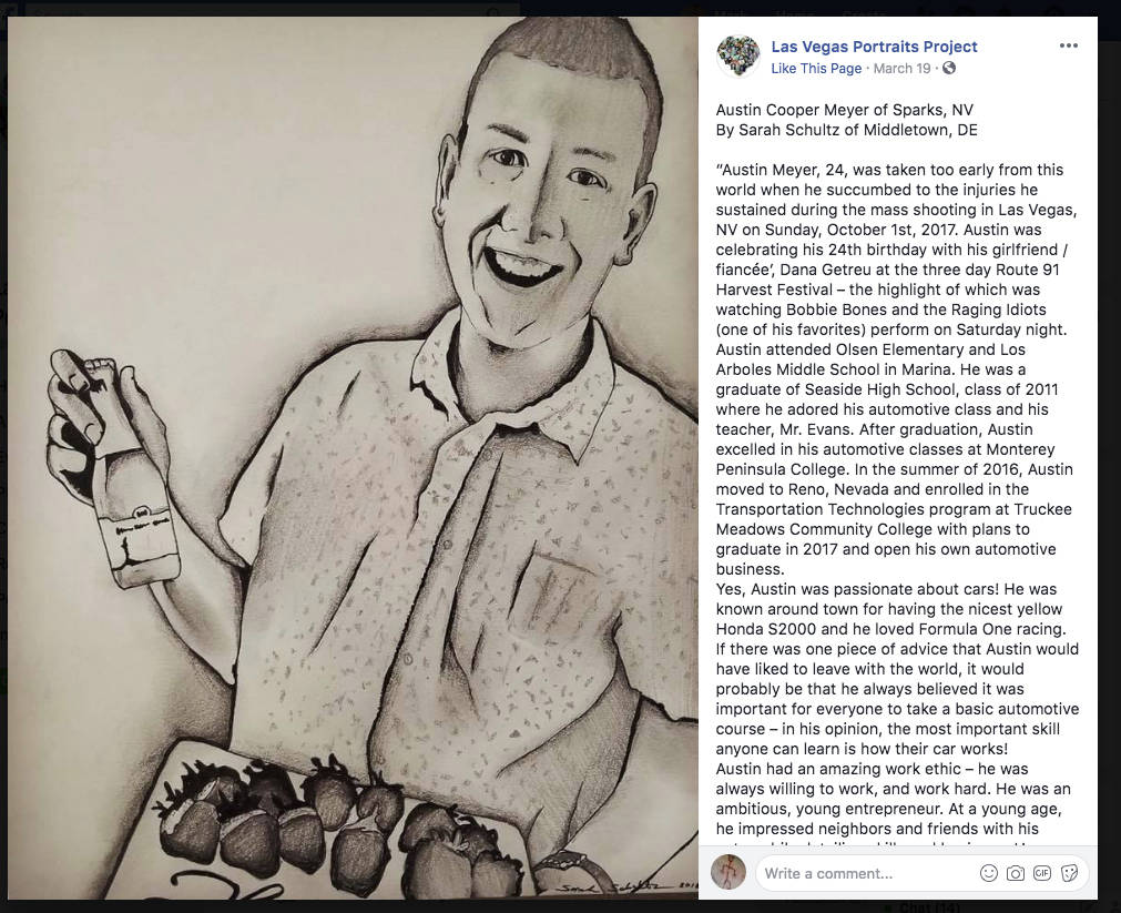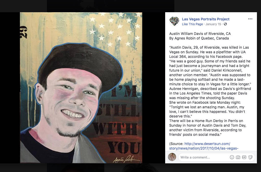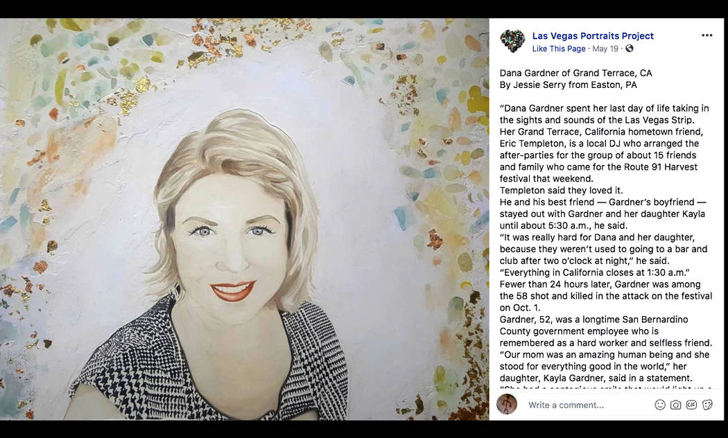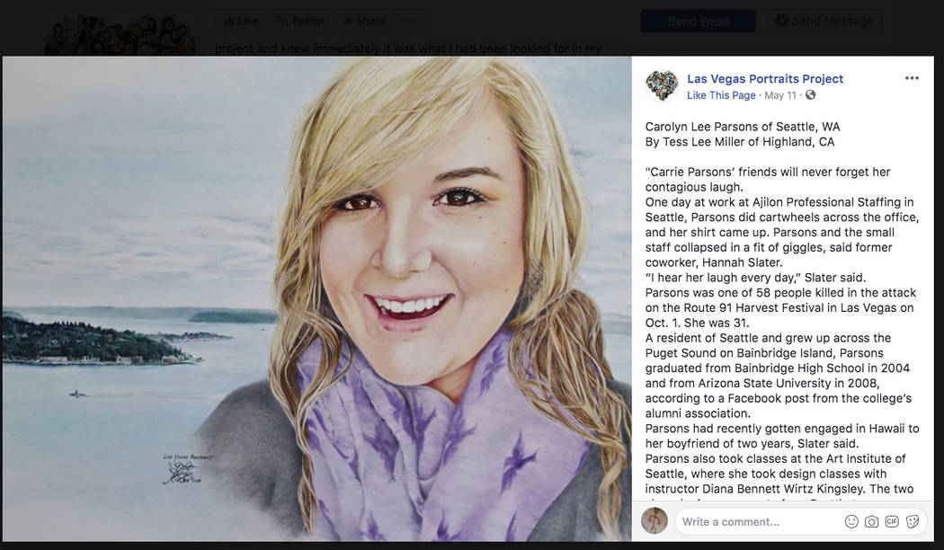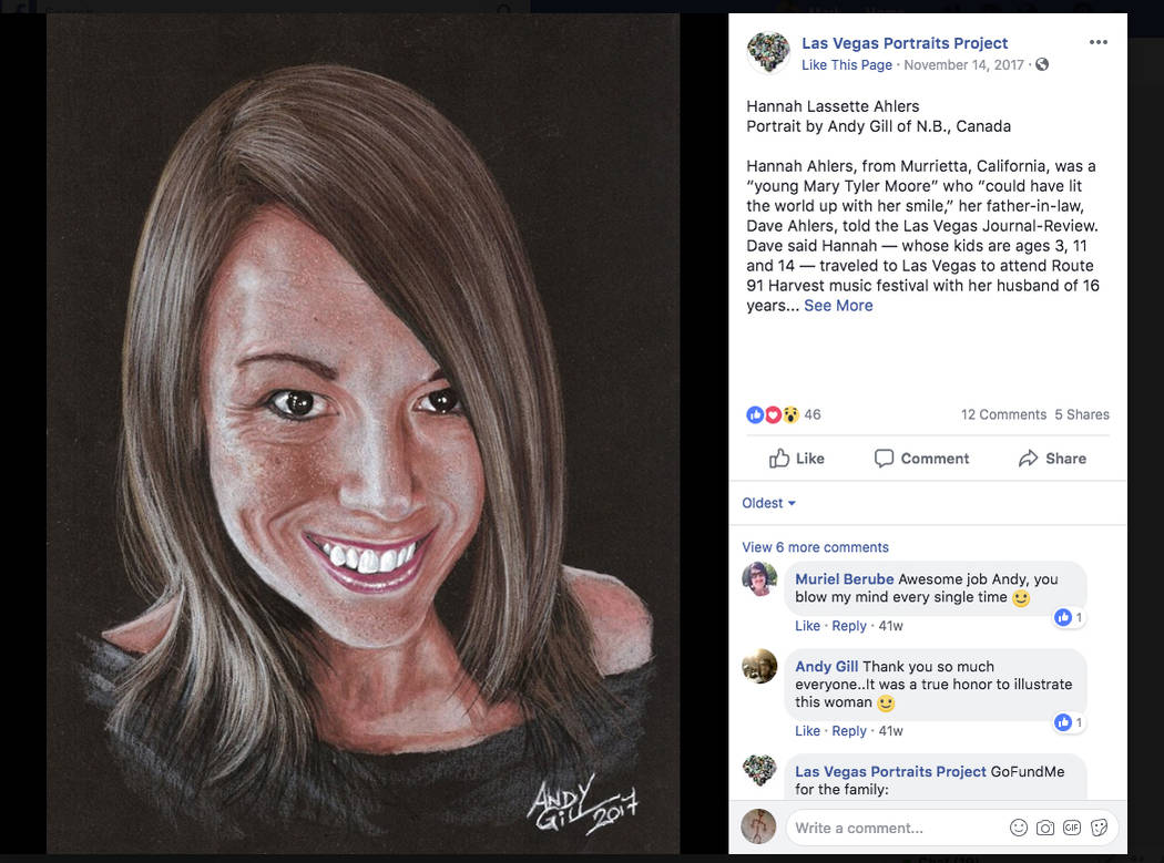 The portrait project was organized by Kortney Struempf of Georgia and Ellen Abramo of Pennsylvania, cousins and artists who participated in a similar project to honor victims of the June 2016 Pulse nightclub shooting in Orlando . Struempf said that when she and Abramo learned of the Oct. 1 shooting, they immediately felt moved.