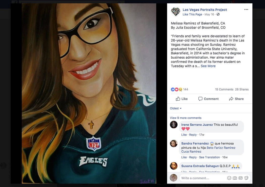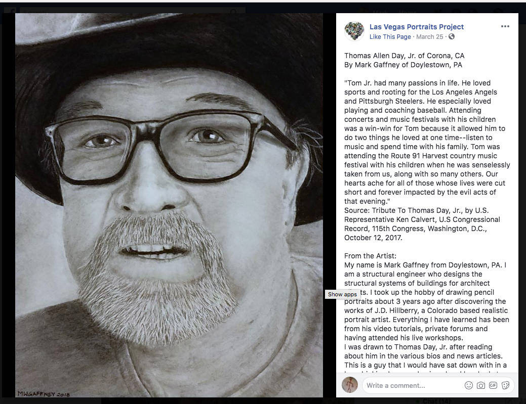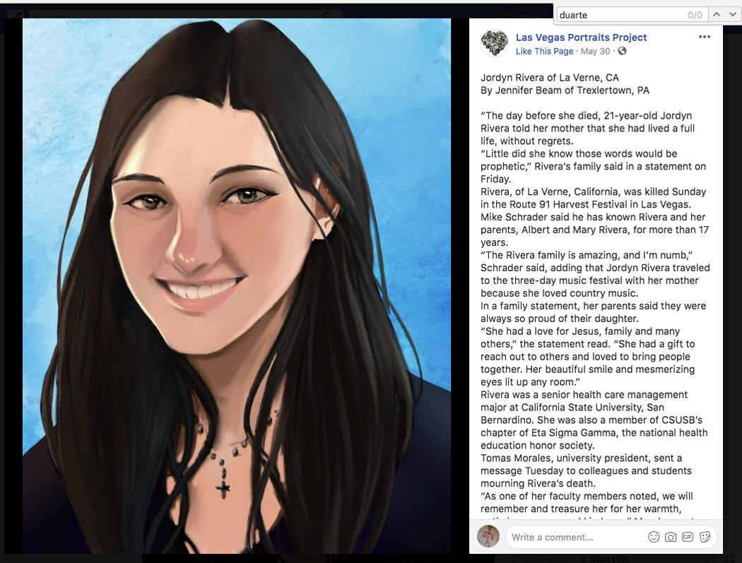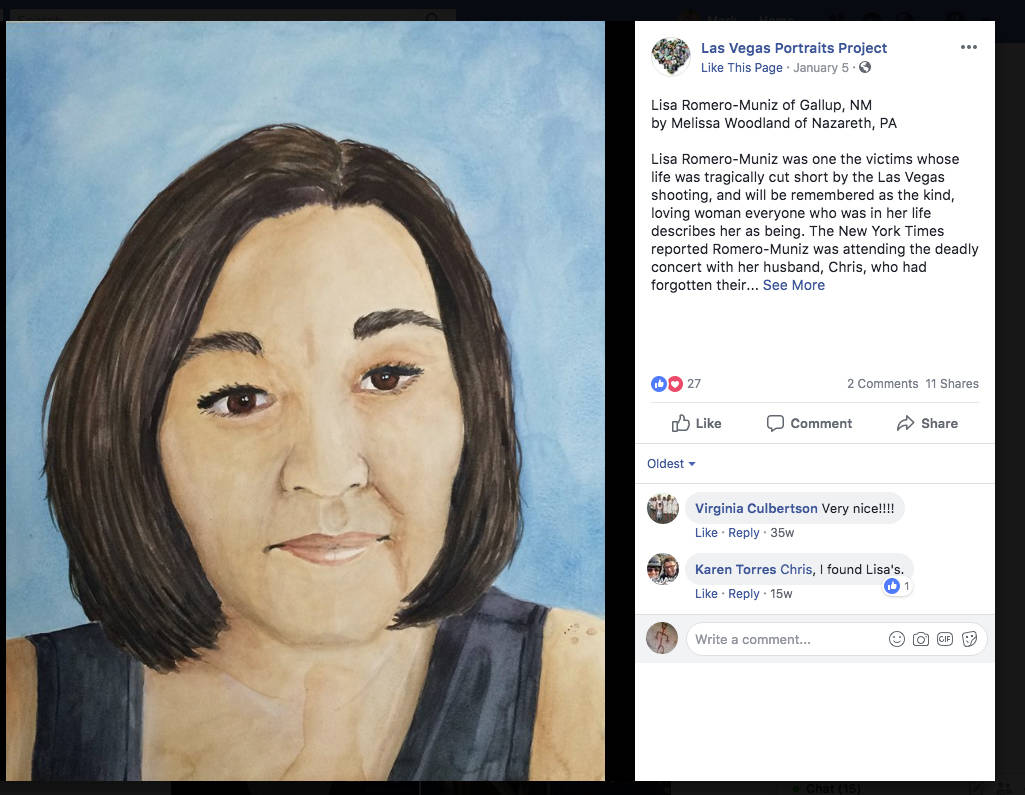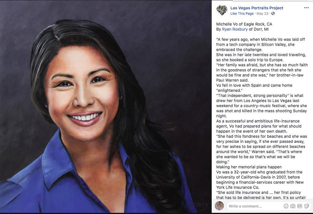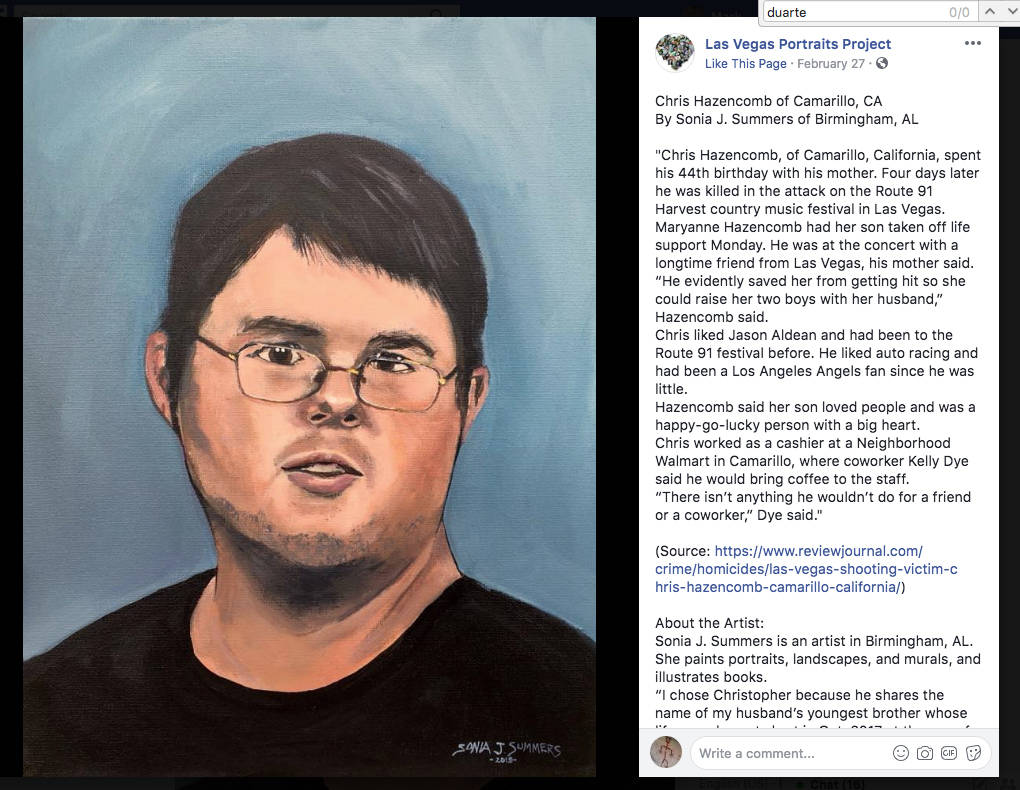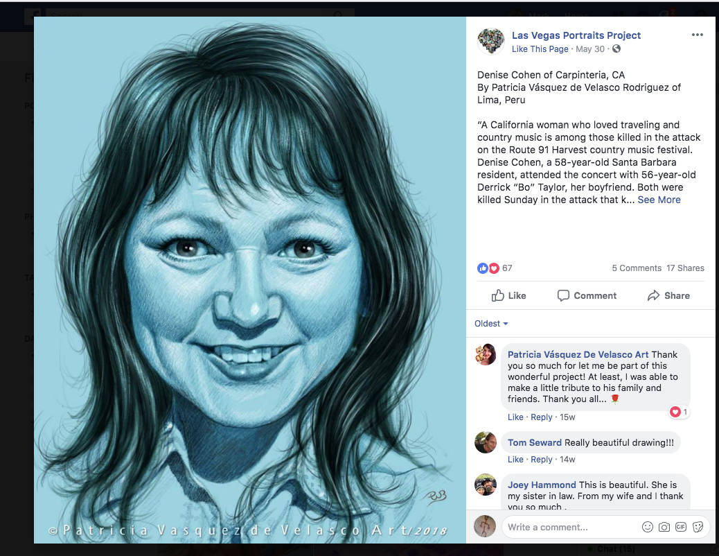 The portrait project was organized by Kortney Struempf of Georgia and Ellen Abramo of Pennsylvania, cousins and artists who participated in a similar project to honor victims of the June 2016 Pulse nightclub shooting in Orlando . Struempf said that when she and Abramo learned of the Oct. 1 shooting, they immediately felt moved.
