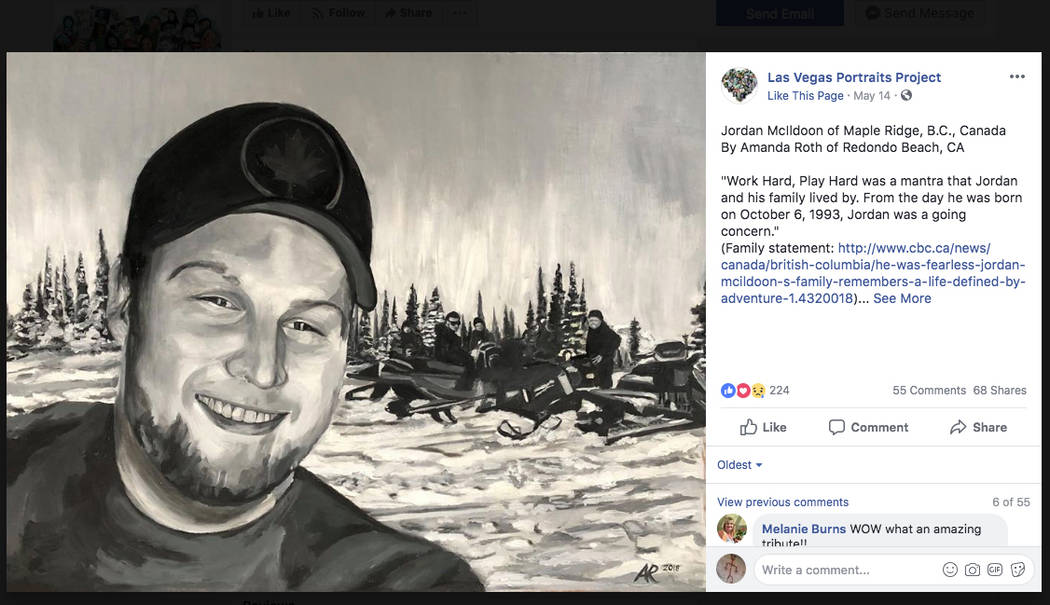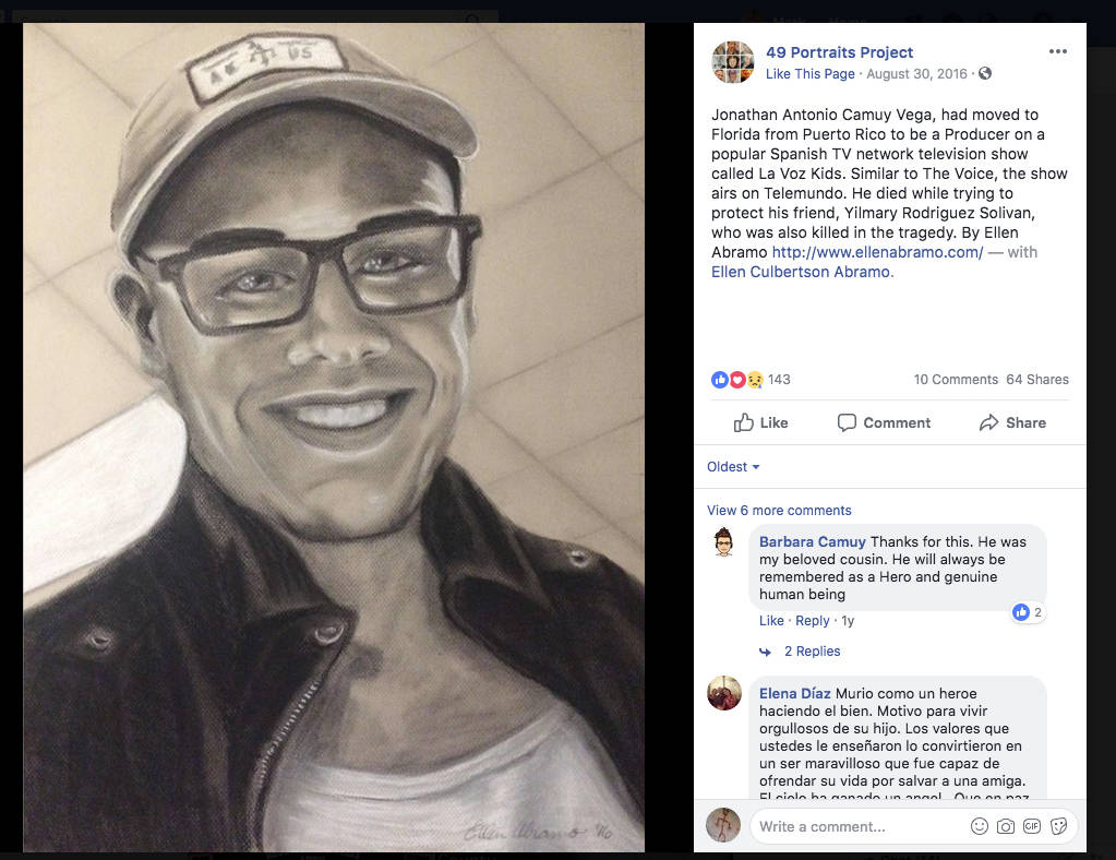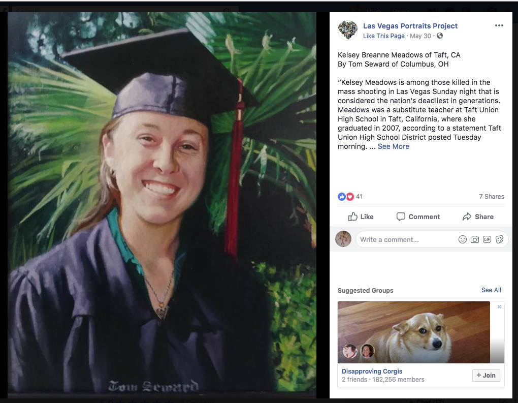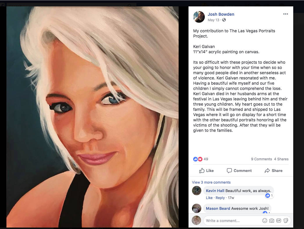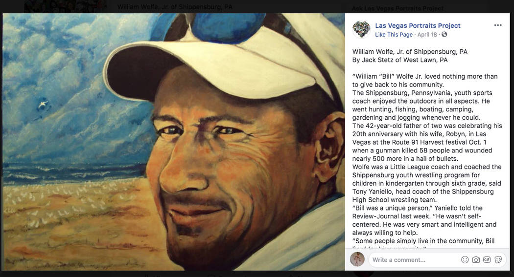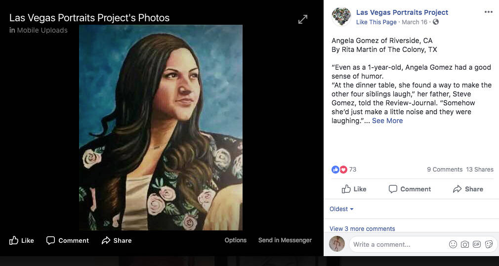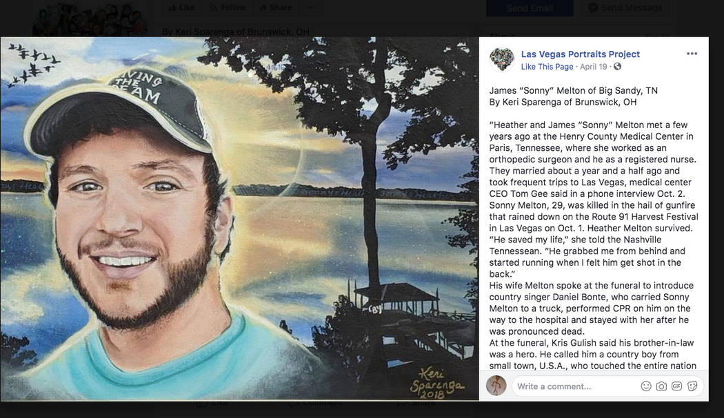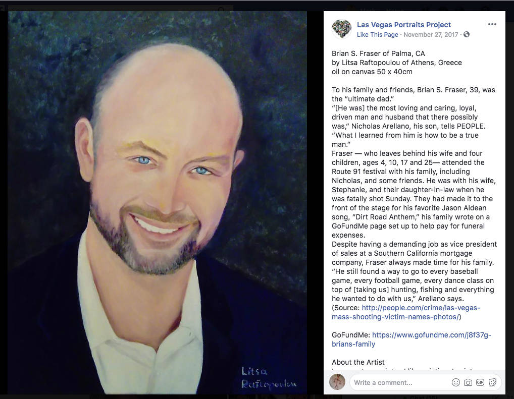 The portrait project was organized by Kortney Struempf of Georgia and Ellen Abramo of Pennsylvania, cousins and artists who participated in a similar project to honor victims of the June 2016 Pulse nightclub shooting in Orlando . Struempf said that when she and Abramo learned of the Oct. 1 shooting, they immediately felt moved.