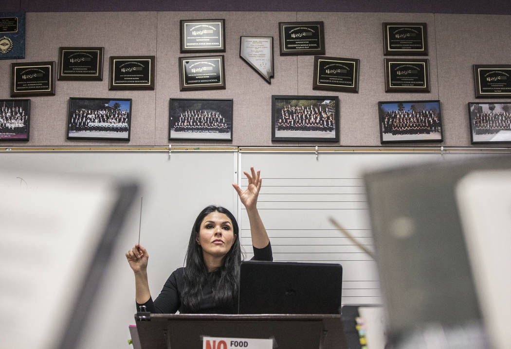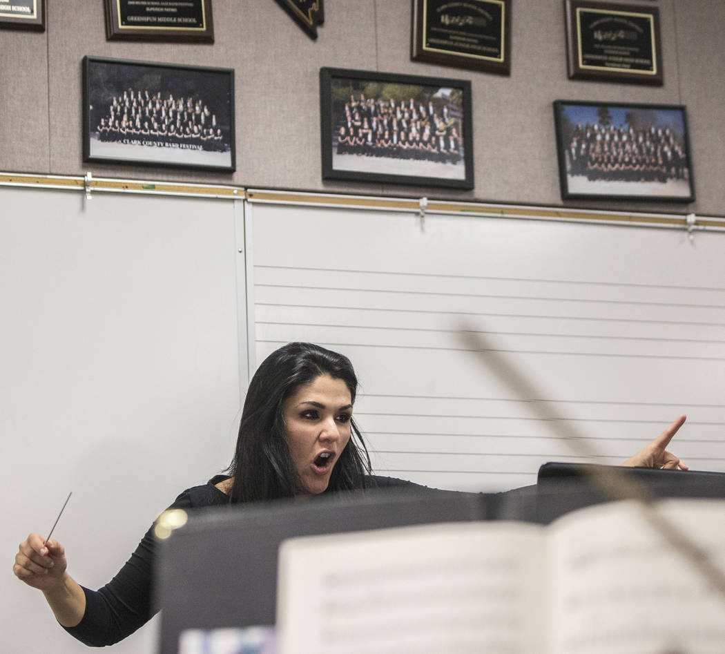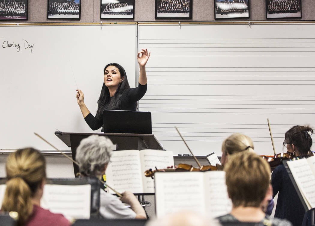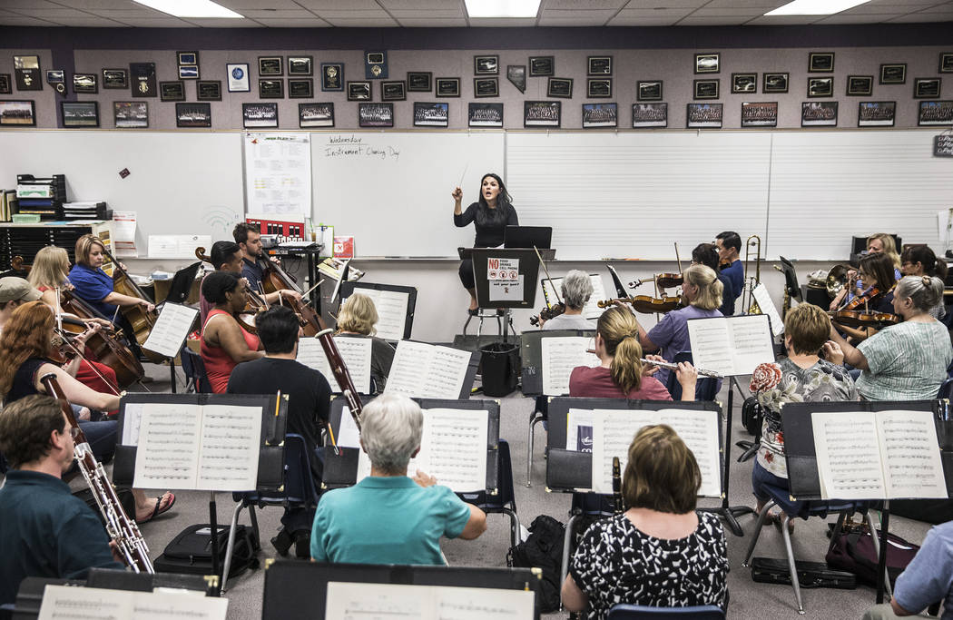 At a recent rehearsal — in the Greenspun Junior High band room — Arrieche leads the orchestra through one of Kunneke’s rousing musical passages.