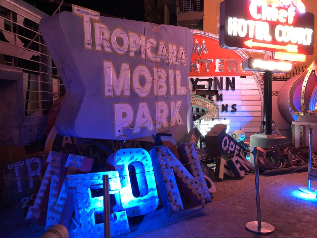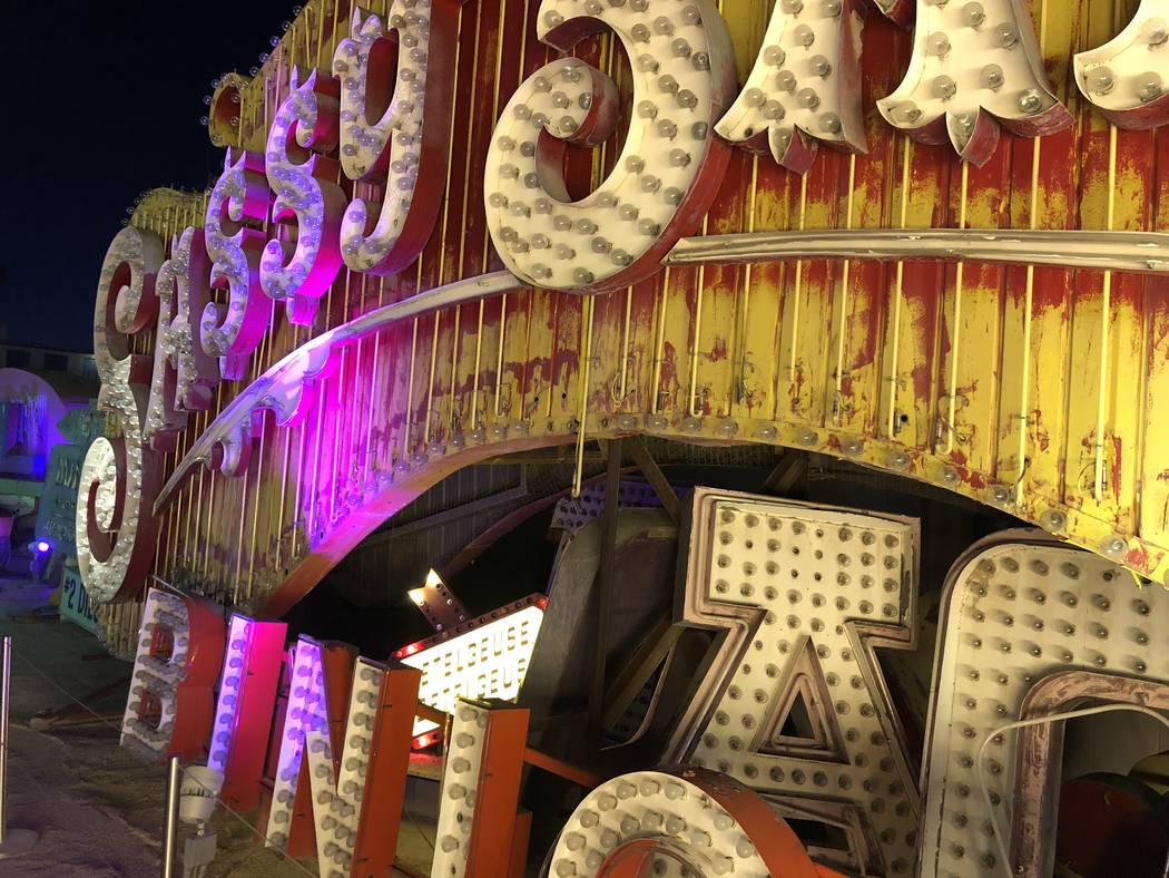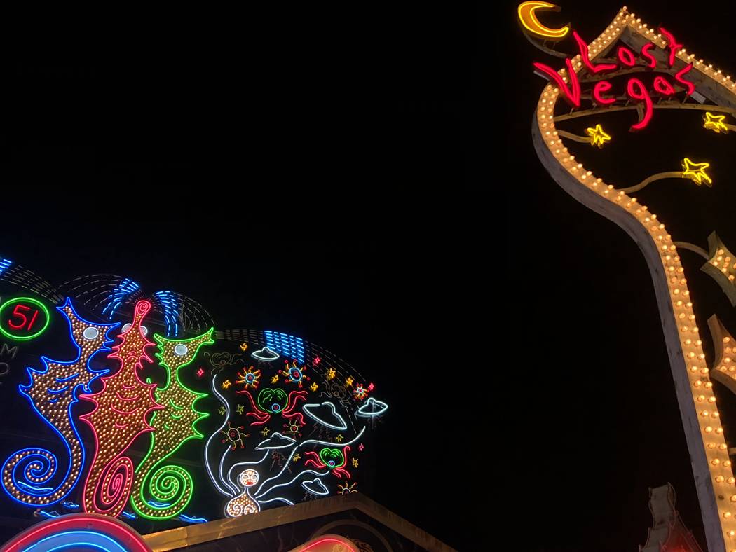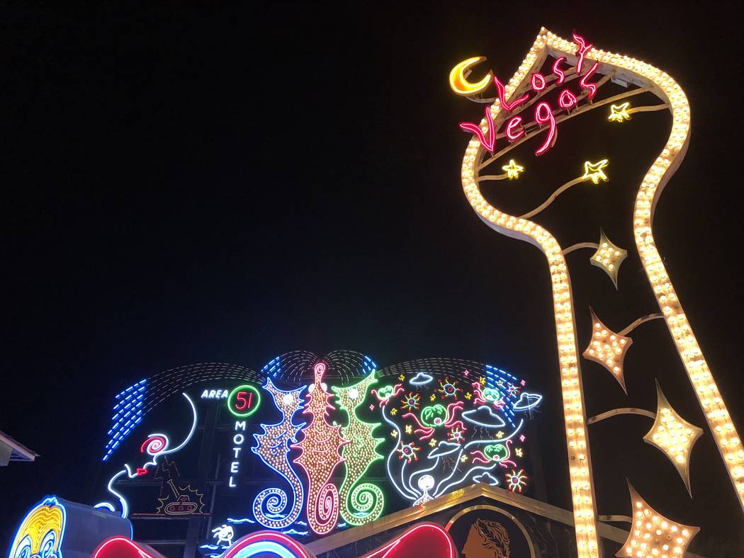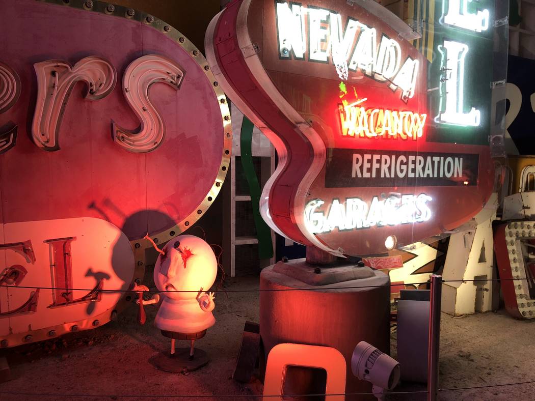 The exhibit’s tallest component is a 40-foot-tall sign tower in the shape of a spade with the words “Lost Vegas” on it.