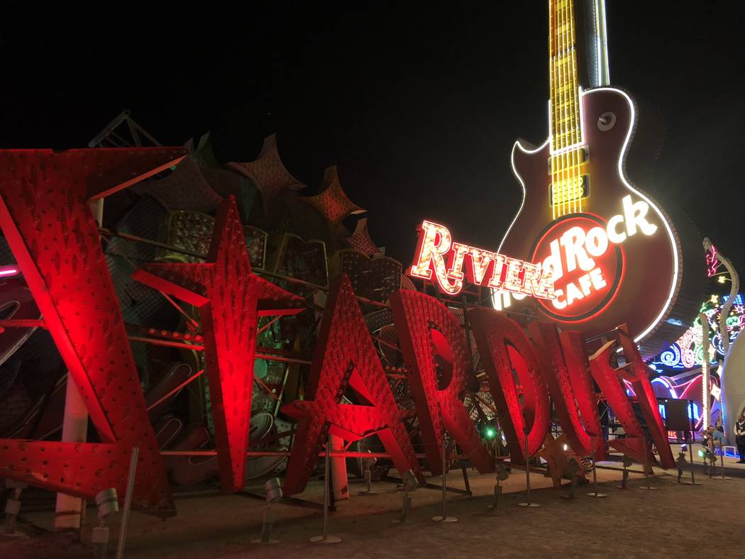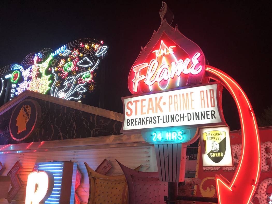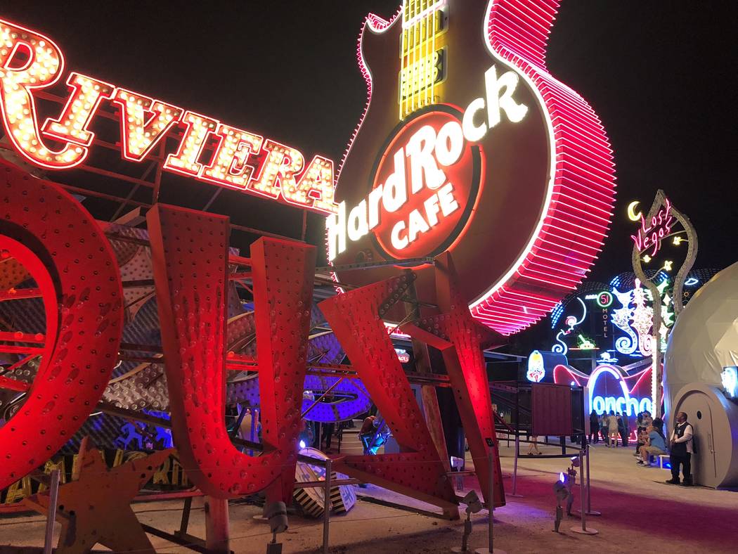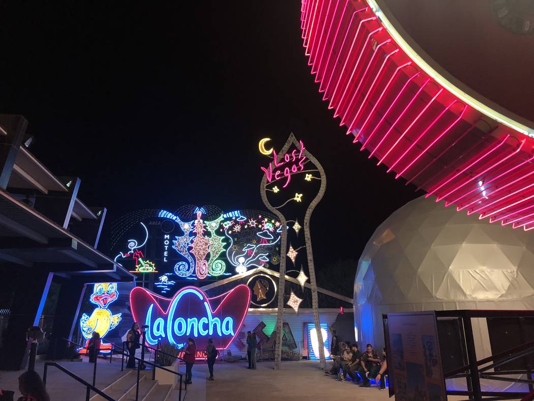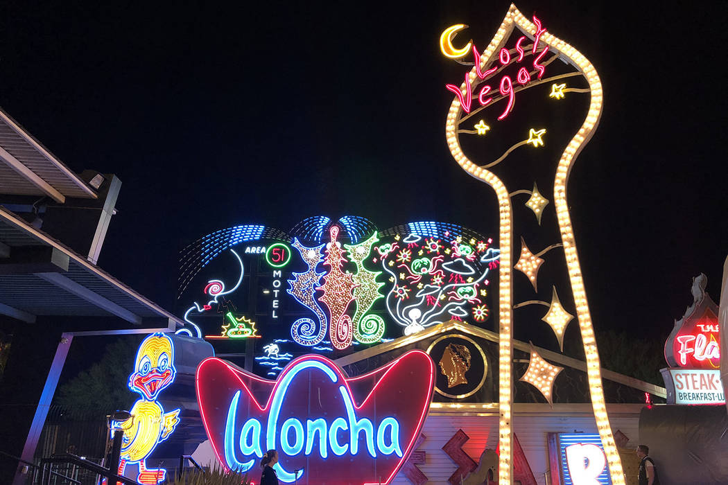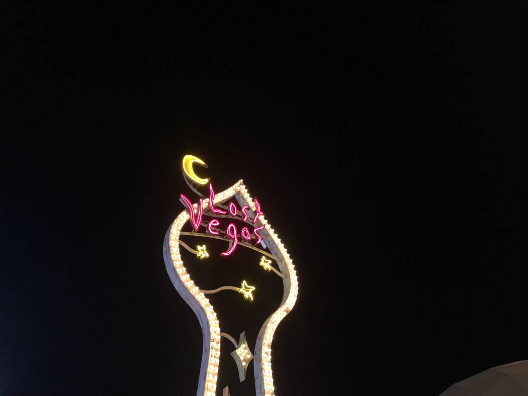 The exhibit’s tallest component is a 40-foot-tall sign tower in the shape of a spade with the words “Lost Vegas” on it.