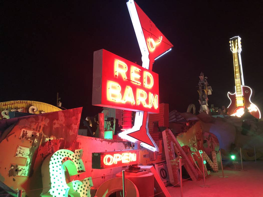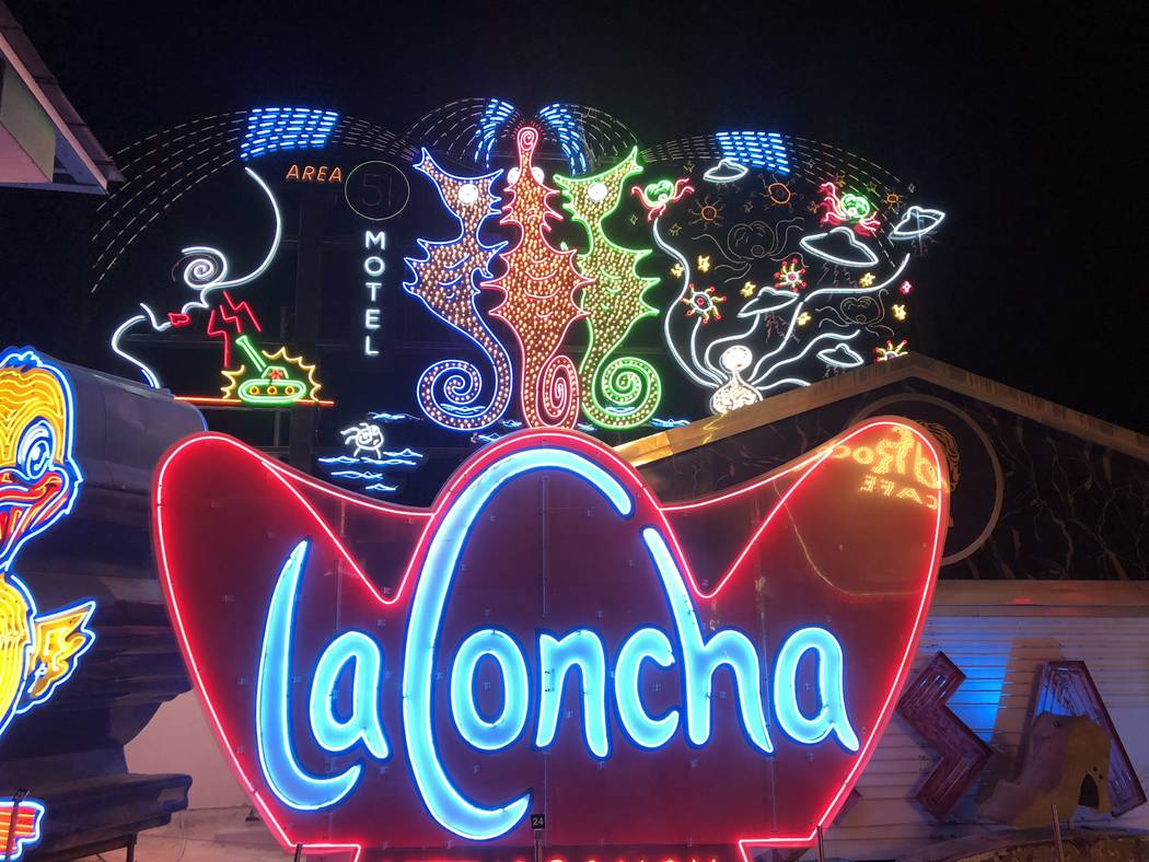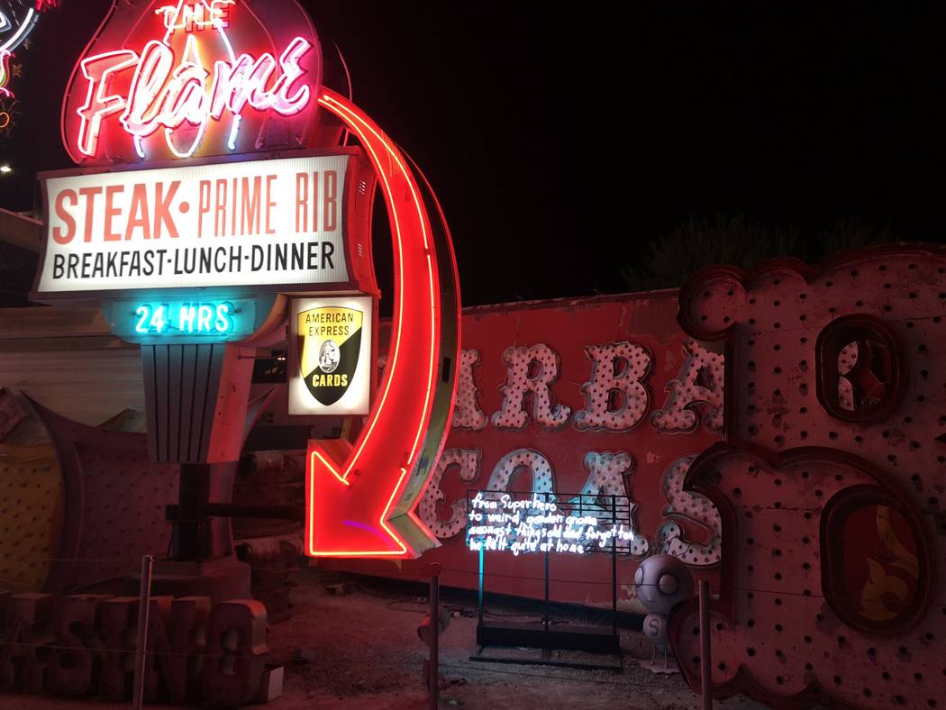 The largest work in the collection is a 40-by-20 foot grid that overlooks the Boneyard. The grid bears six neon signs, including one at its center portraying three neon seahorses Burton saw as a child at the swimming pool at The Dunes hotel.