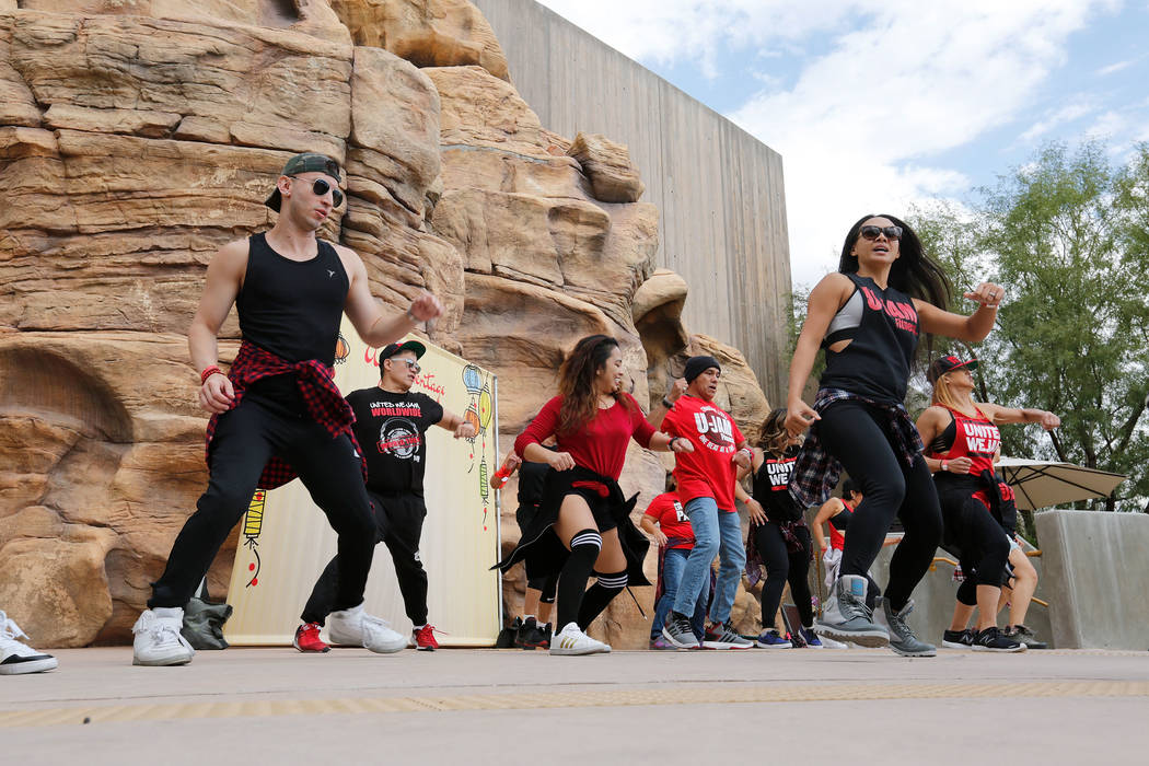 Children wearing red hachimaki headbands tied behind their heads scrambled over rock features Saturday afternoon at the Springs Preserve, pausing only to practice martial arts with little hands chopping the air.