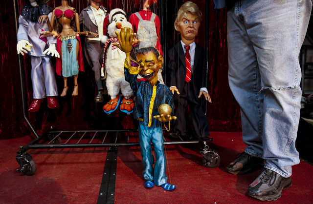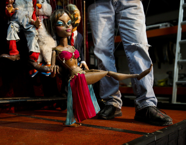 The cast members range from the aforementioned Trump puppet to Fatima, a belly dancer with “Angelina Jolie’s face and Rihanna’s body,” their creator explains. A juggler marionette inspired by comedian Gilbert Gottfried has 17 strings, controlling his mouth, eyes, hands, legs, eyebrows, tongue (which he can stick out at impudent moments) and two juggling balls.