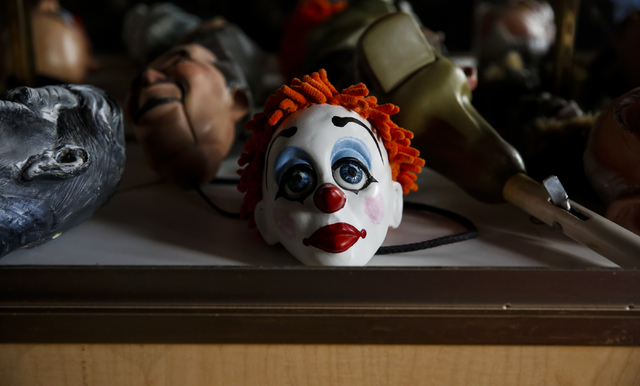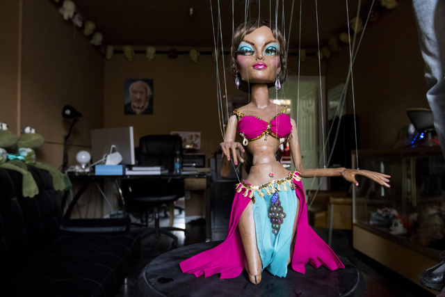 The cast members range from the aforementioned Trump puppet to Fatima, a belly dancer with “Angelina Jolie’s face and Rihanna’s body,” their creator explains. A juggler marionette inspired by comedian Gilbert Gottfried has 17 strings, controlling his mouth, eyes, hands, legs, eyebrows, tongue (which he can stick out at impudent moments) and two juggling balls.