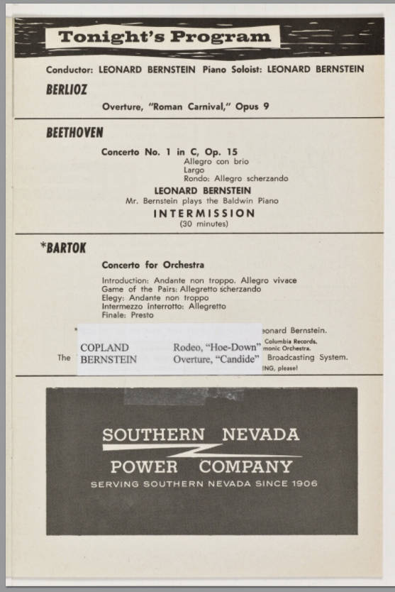 The Las Vegas Symphony Society and the Clark County Fair and Recreation Board were listed as concert sponsors, according to the evening’s program (preserved in the New York Philharmonic’s digital archives).