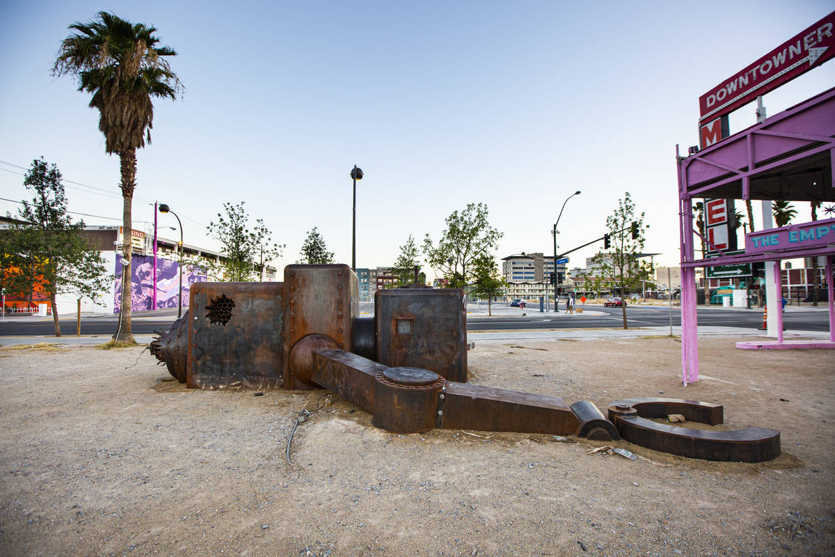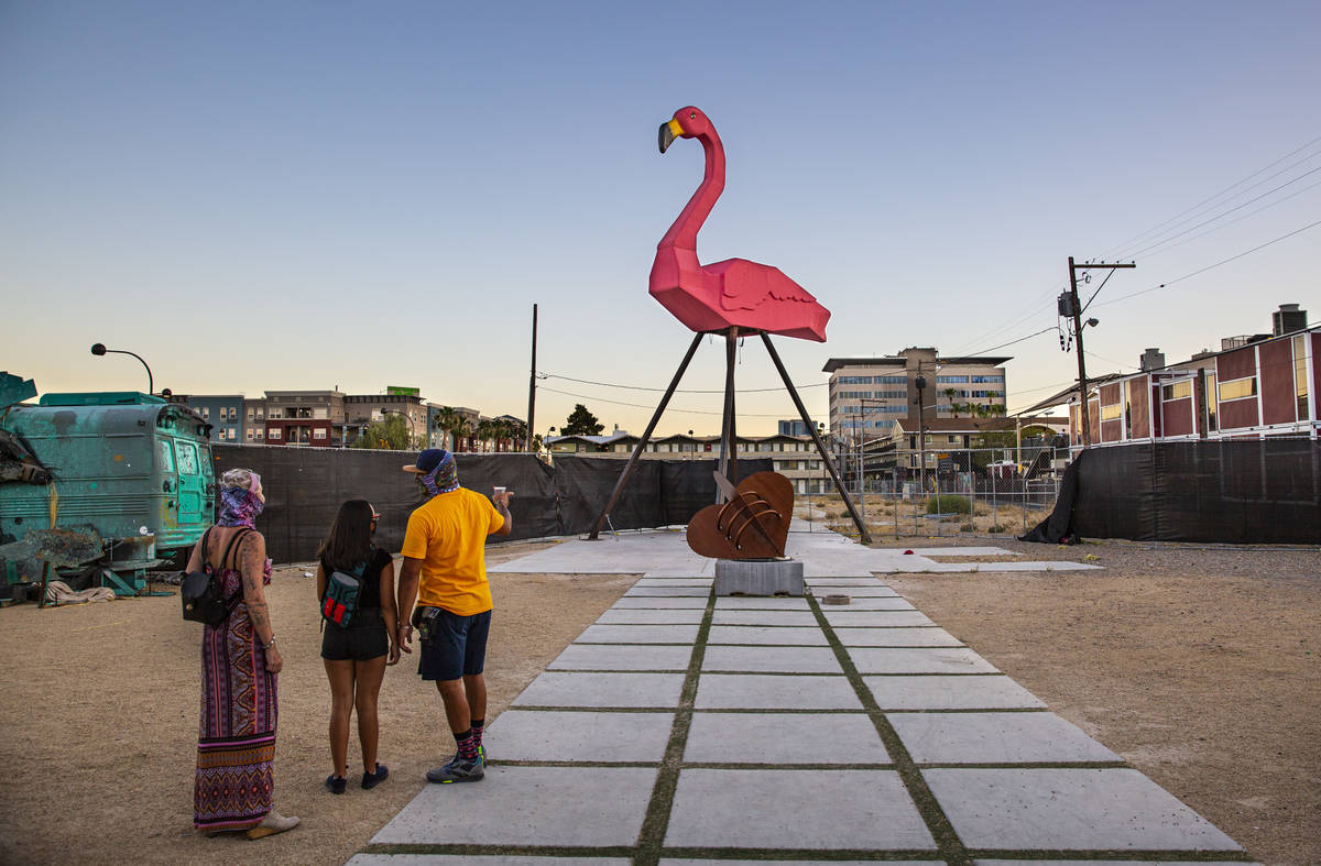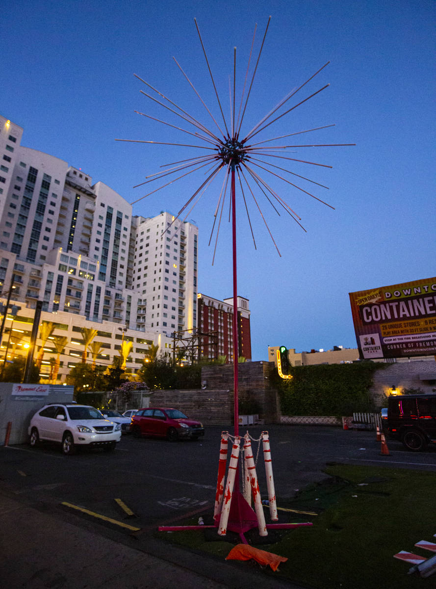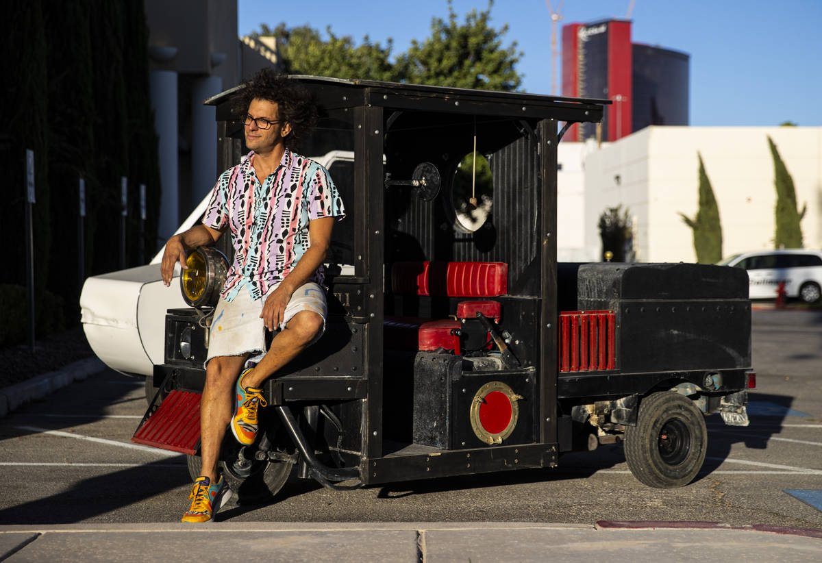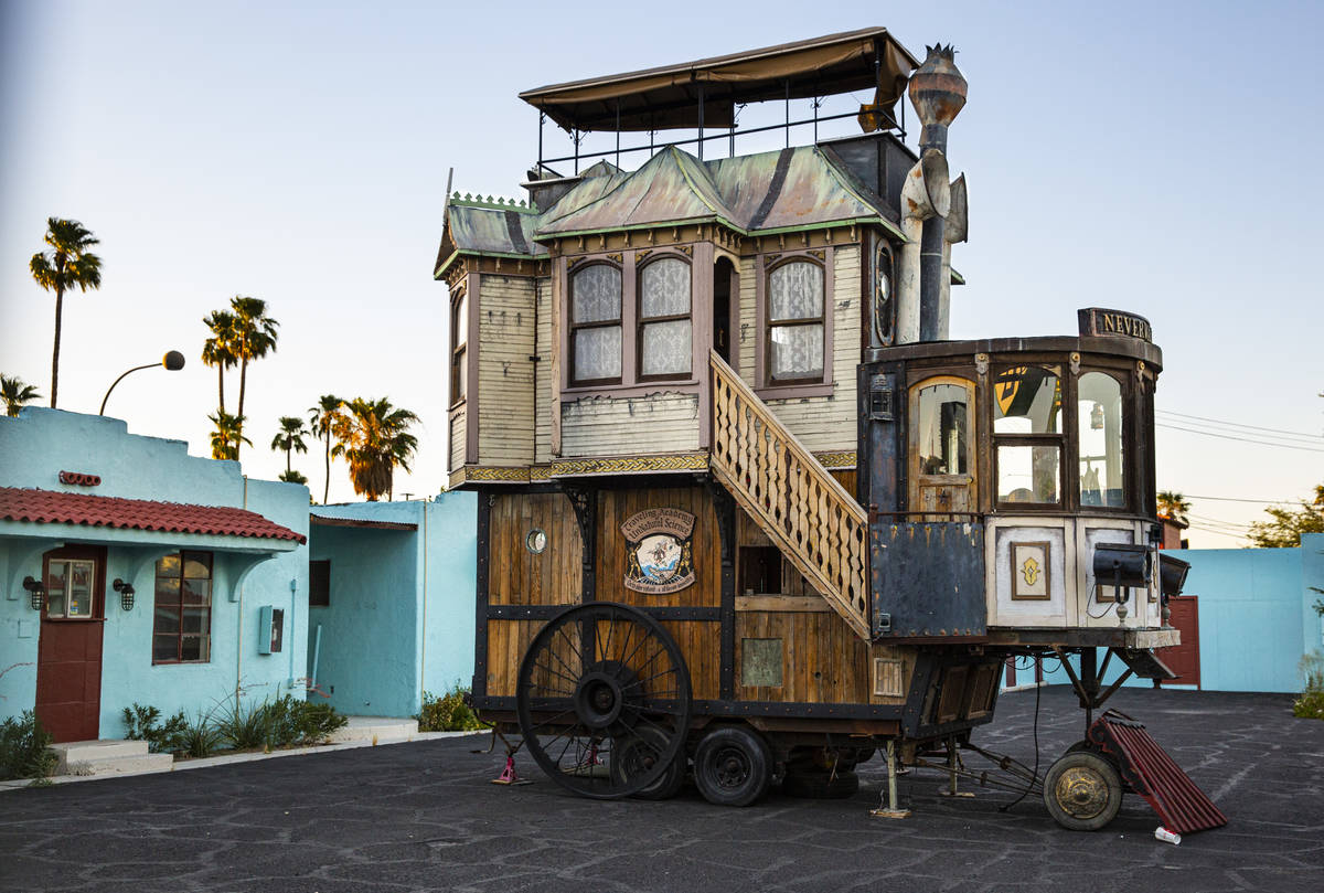 In addition to the eight art pieces he helped to acquire for the Area15’s Art Island, he has installed a handful of items downtown, including a blinking firework sculpture, an oversized flamingo lawn ornament, a splayed out robot and the three-story Neverwas Haul mobile art vehicle built to resemble a Victorian house on wheels.
