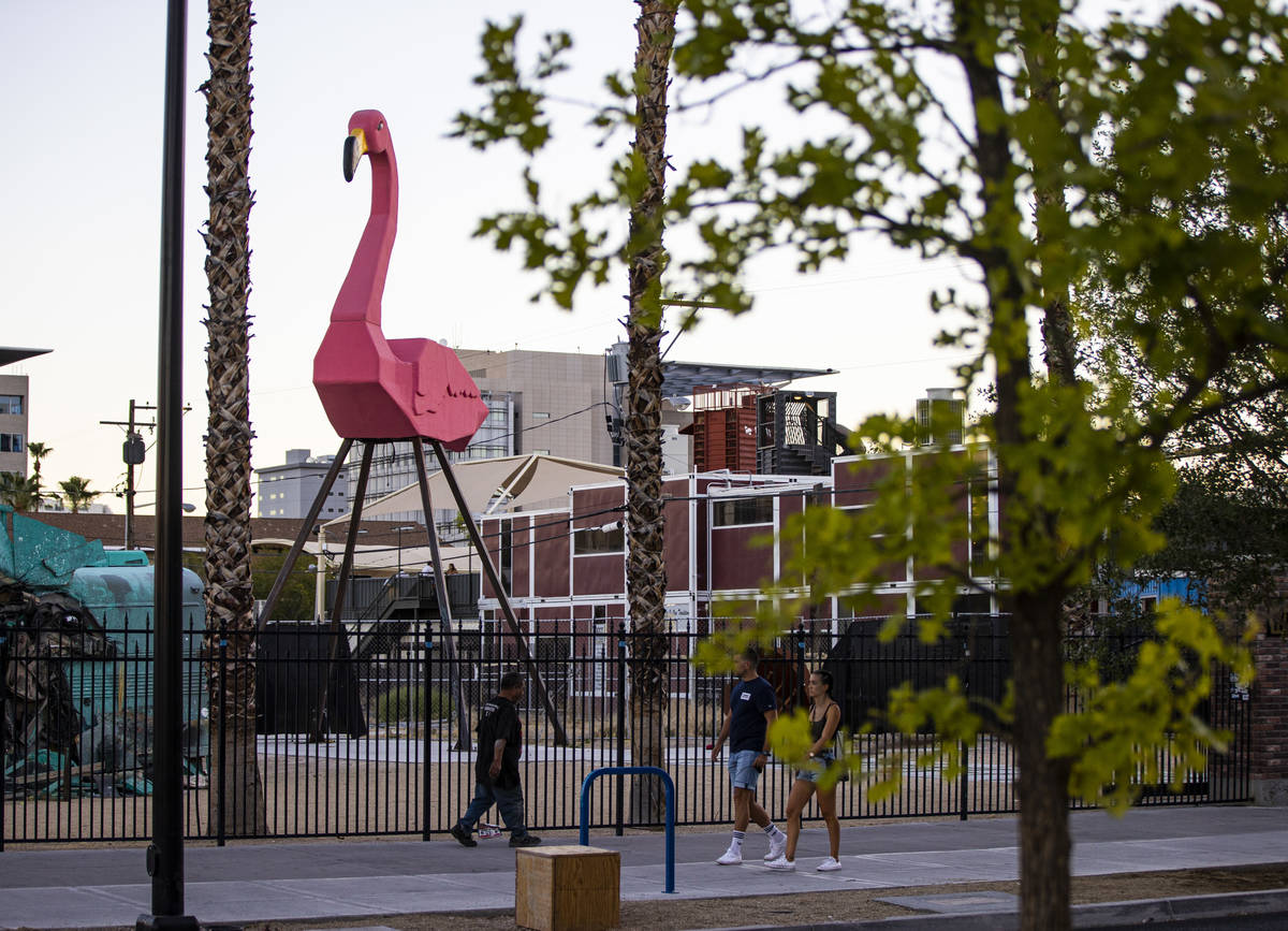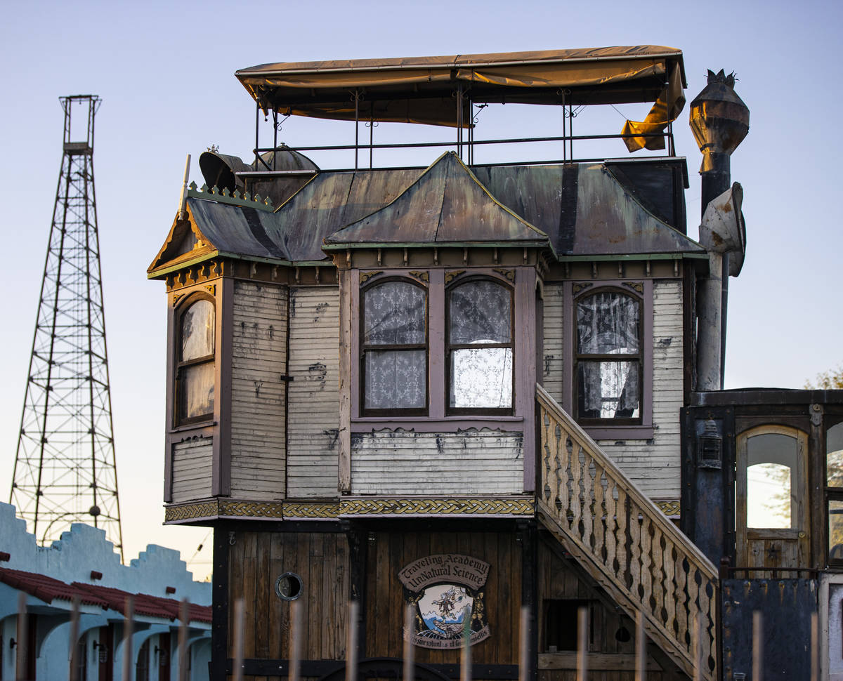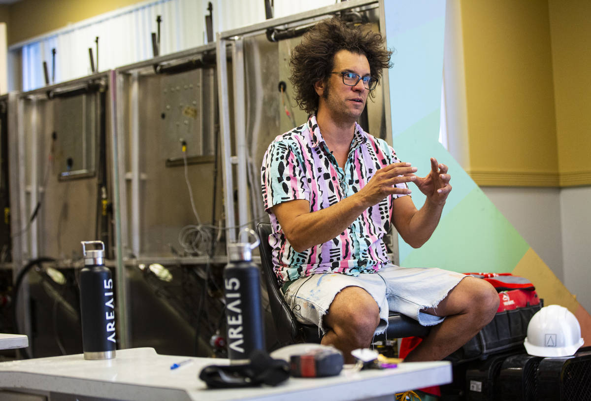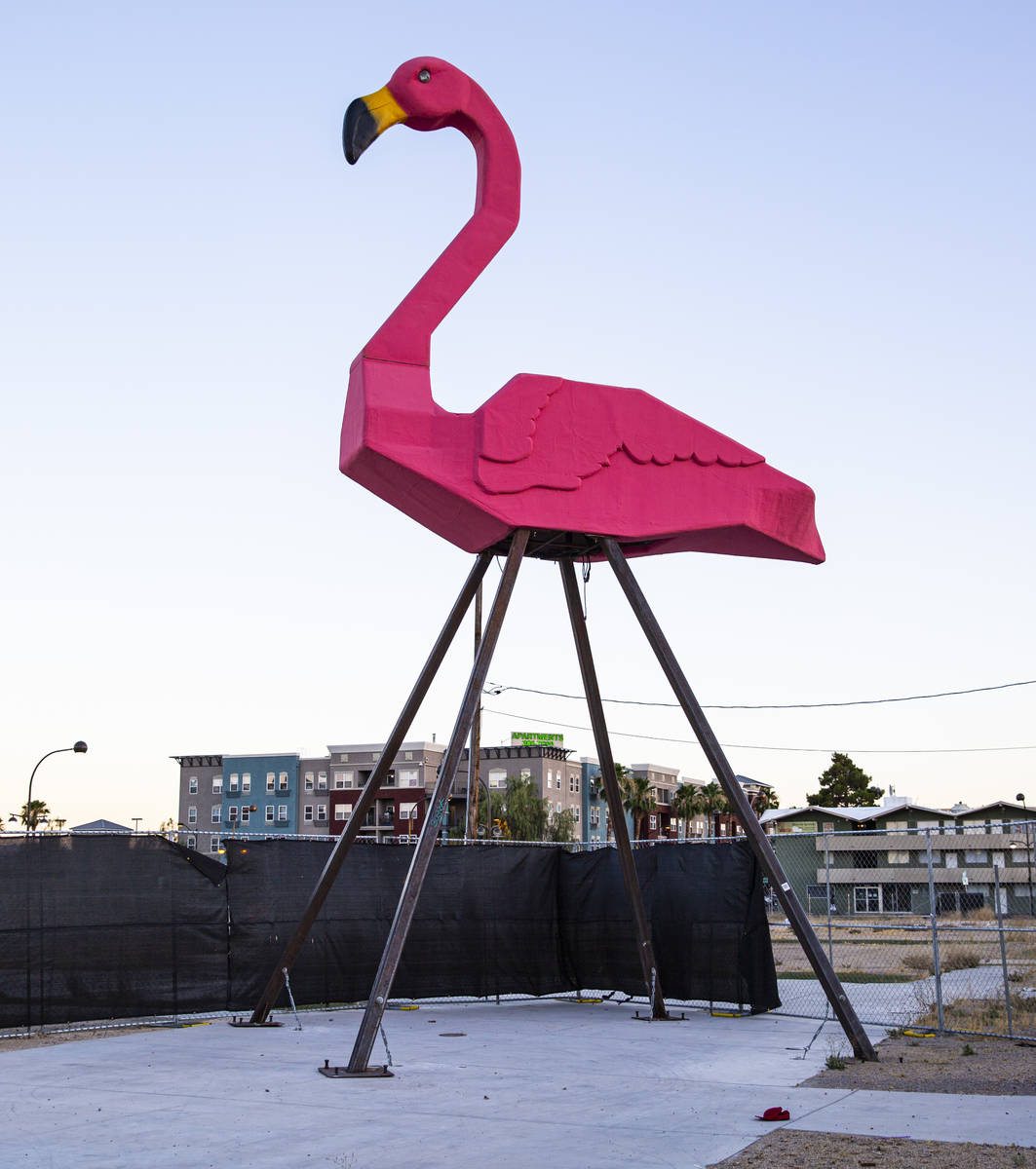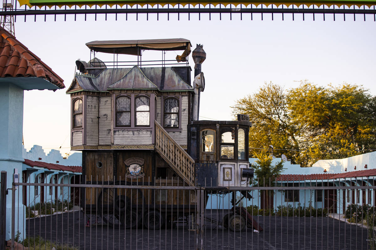 In addition to the eight art pieces he helped to acquire for the Area15’s Art Island, he has installed a handful of items downtown, including a blinking firework sculpture, an oversized flamingo lawn ornament, a splayed out robot and the three-story Neverwas Haul mobile art vehicle built to resemble a Victorian house on wheels.