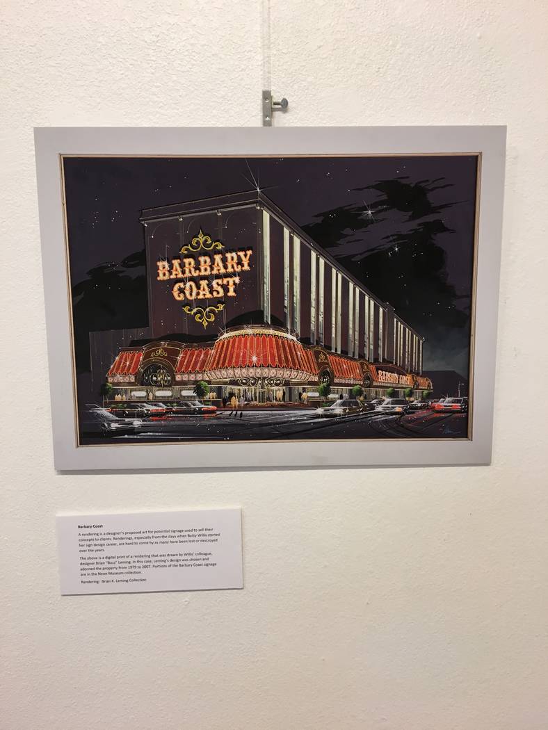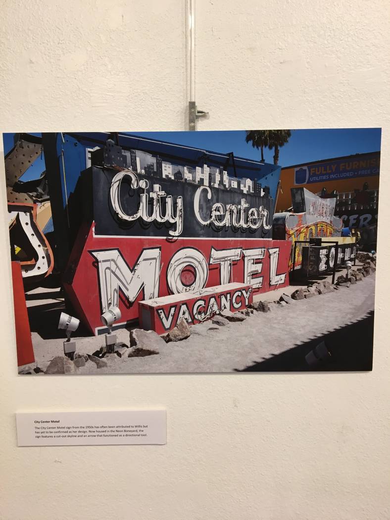 The exhibit was planned in collaboration with the Neon Museum in Las Vegas, which houses some of Willis’ signs. It will include photographs of Willis in front of her signs, a lithograph of the “Welcome to Fabulous Las Vegas” sign signed by her and photographer William Hannaple, and a rendering of the Barbary Coast neon sign designed by her colleague Brian Buzz Leming.