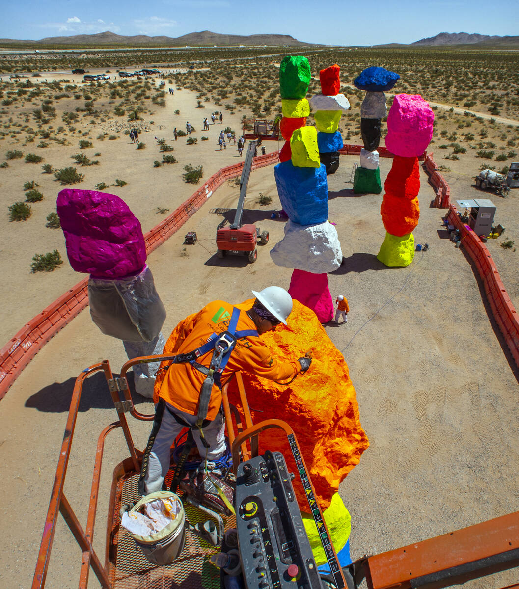 Jose Cervantes with the Vergith Contracting Co. begins to add a white finish color to a totem at the Seven Magic Mountains art installation on Wednesday, June 5, 2019, in Las Vegas. (L.E. Baskow/Las Vegas Review-Journal) @Left_Eye_Images