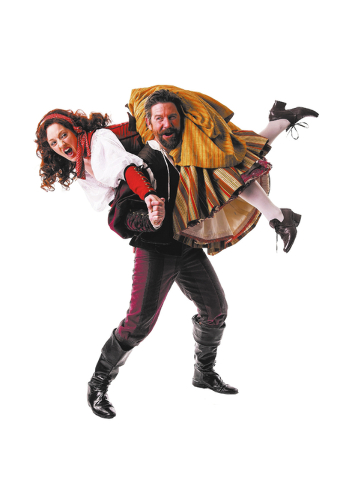 Initially, Adams took a “knock-down, slapstick, kick-‘em-in-the-slats” approach to the (mis)match between the fortune-hunting Petruchio (played by artistic co-director Brian Vaughn) and the strong-willed Katherina (Melinda Pfundstein, alias Vaughn’s real-life wife).