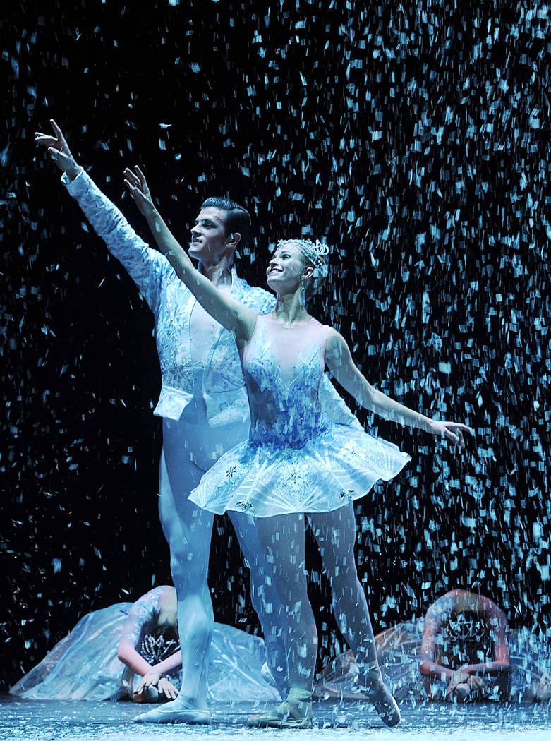 Dazzling costumes further delineate between reality and fantasy. Snowflakes twirl in structured skirts that flare out in convincing fractals. Dresses made of pastel petals ruffle and ripple during “Waltz of the Flowers.” The stage even wears a light dusting of snow.