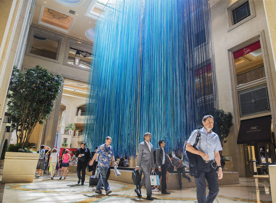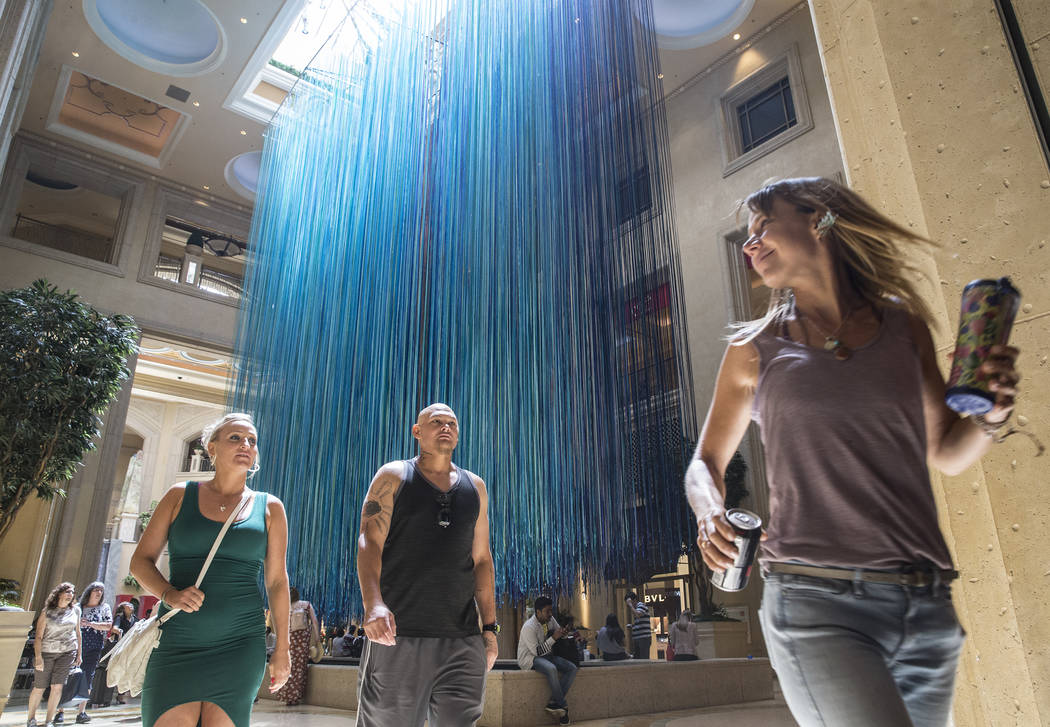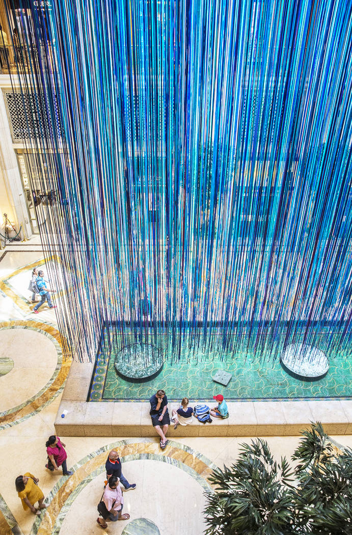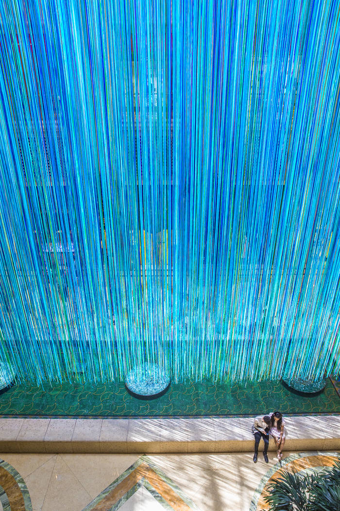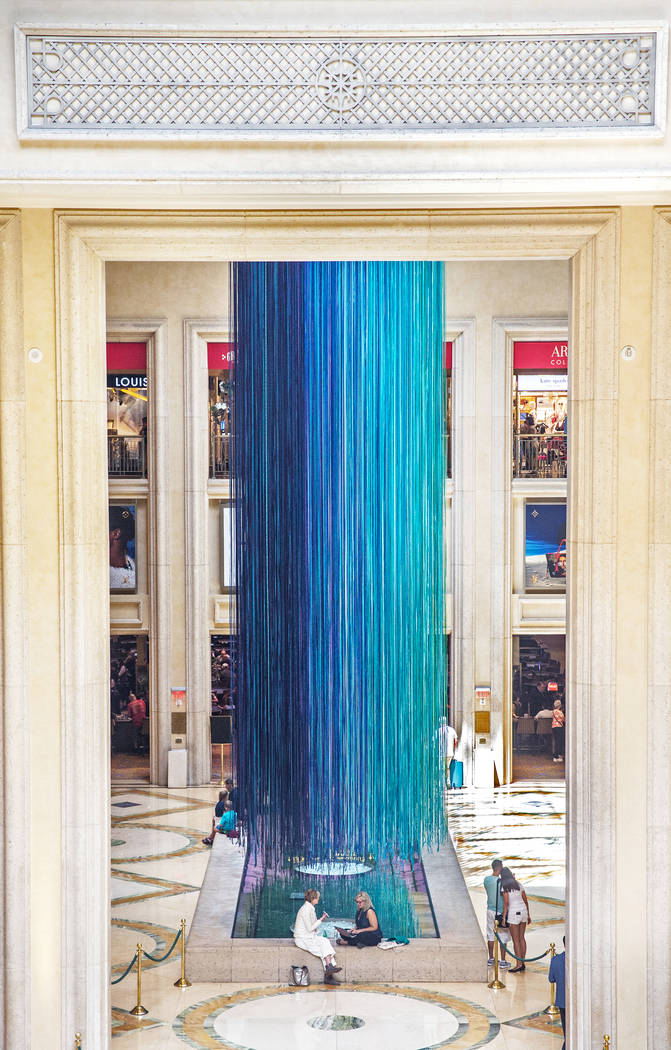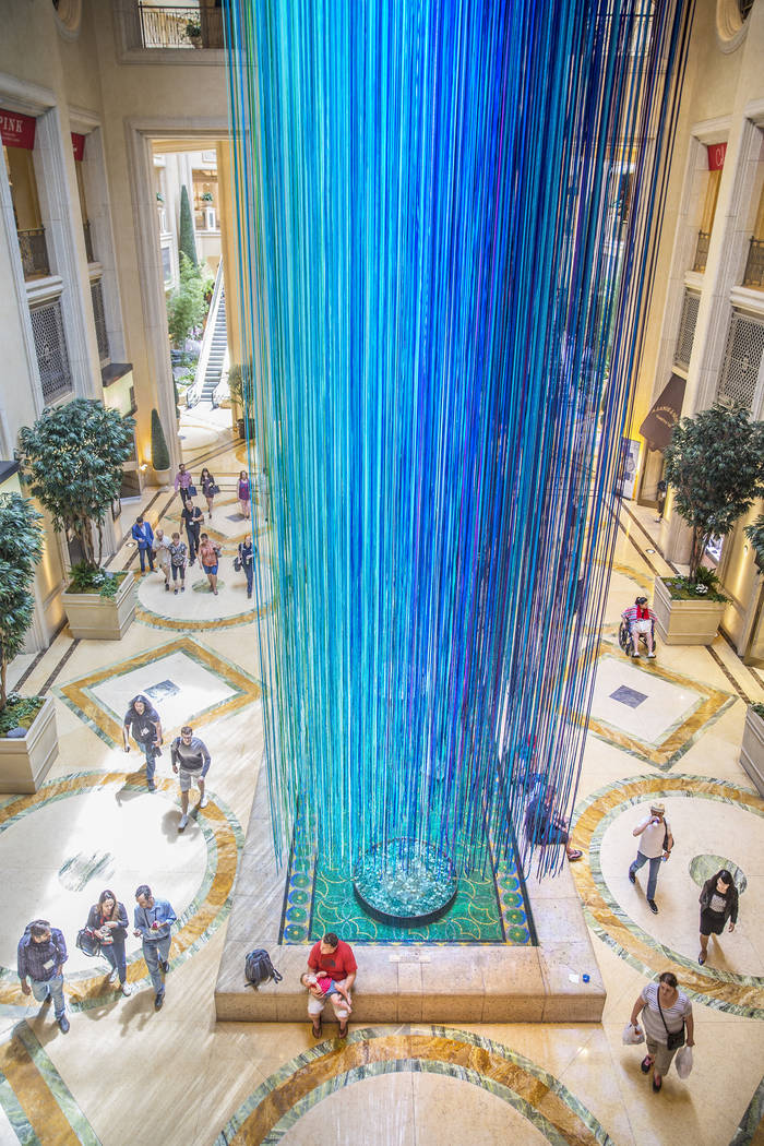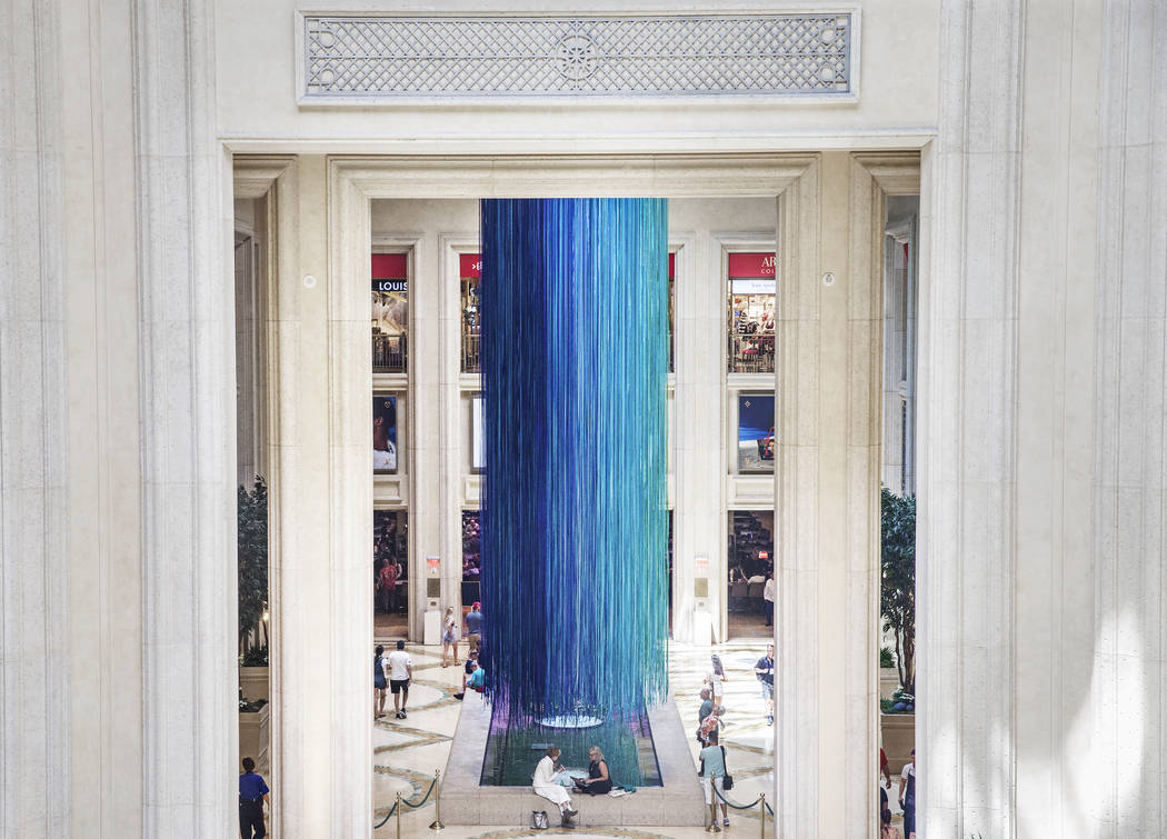 “Another Sky,” a new, temporary art installation at The Venetian hotel-casino’s Waterfall Atrium, is comprised of 3,590 strands of satin ribbon in 15 cool-toned colors ranging from turquoise to plum. Artist Anne Patterson created a similar piece in 2013 for San Francisco’s famed Grace Cathedral.