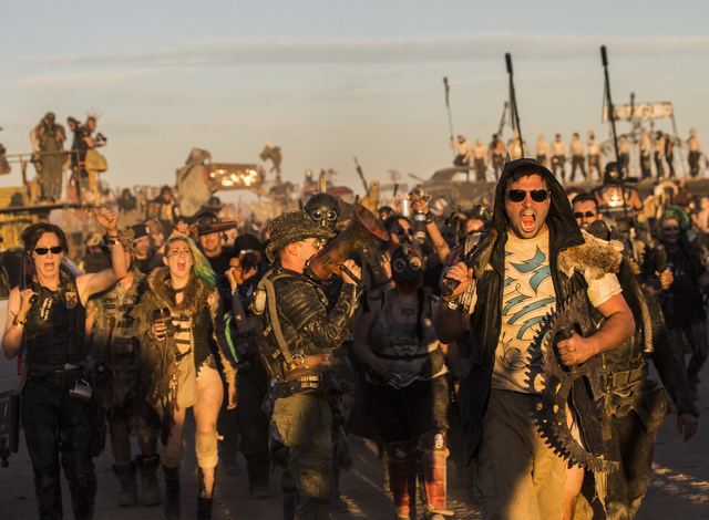 A large crowd of festival goers march through the camp ground during the seventh annual Wasteland Weekend on Saturday, Sept. 24, 2016, in California City, Calif. The four day, post-apocalyptic festival takes place in the Mojave desert and is inspired by director George Miller’s Mad Max films. Benjamin Hager/Las Vegas Review-Journal