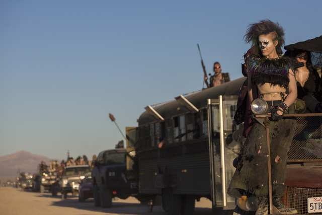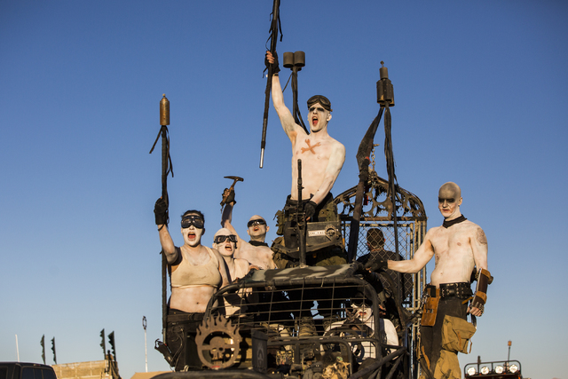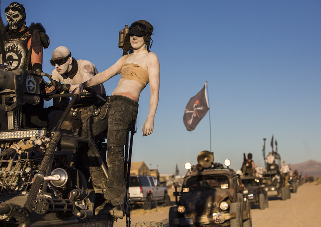 War boys participate in a vehicle cruise during the seventh annual Wasteland Weekend on Friday, Sept. 23, 2016, in California City, Calif. The four day, post-apocalyptic festival takes place in the Mojave desert and is inspired by director George Miller’s Mad Max films. Benjamin Hager/Las Vegas Review-Journal