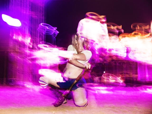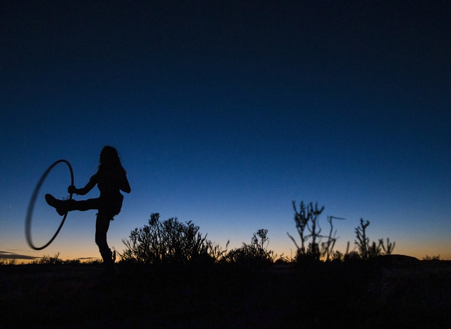 Allison Messick plays with a hula hoop at dusk during the seventh annual Wasteland Weekend on Friday, Sept. 23, 2016, in California City, Calif. The four day, post-apocalyptic festival takes place in the Mojave desert and is inspired by director George Miller’s Mad Max films. Benjamin Hager/Las Vegas Review-Journal