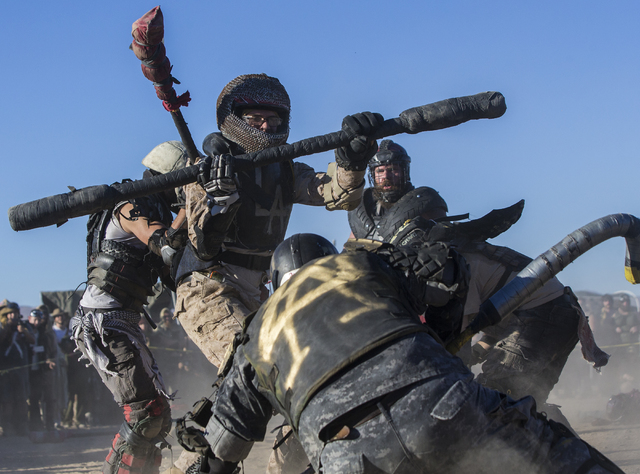 Competitors take part in a jugger match during the seventh annual Wasteland Weekend on Friday, Sept. 23, 2016, in California City, Calif. The four day, post-apocalyptic festival takes place in the Mojave desert and is inspired by director George Miller’s Mad Max films. Benjamin Hager/Las Vegas Review-Journal