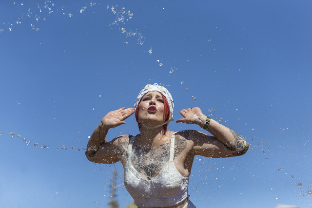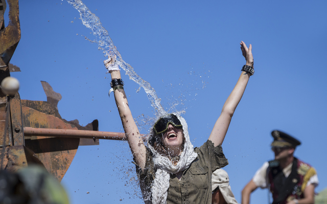 Kerryssa Berroyer, a member of the Nuclear Bombshells, a post-apocalyptic burlesque group based in Las Vegas, cools off during the seventh annual Wasteland Weekend on Saturday, Sept. 24, 2016, in California City, Calif. The four day, post-apocalyptic festival takes place in the Mojave desert and is inspired by director George Miller’s Mad Max films. Benjamin Hager/Las Vegas Review-Journal