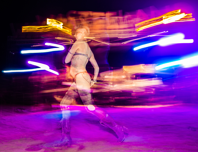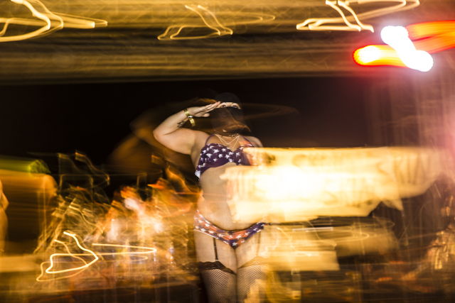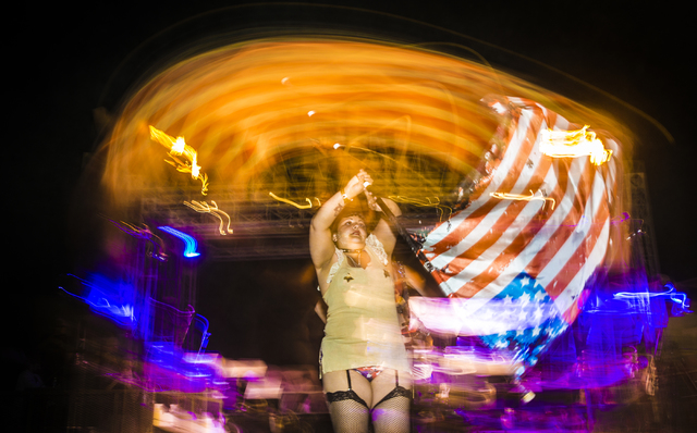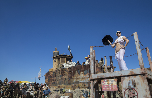 Goldie Vegas, a member of the Nuclear Bombshells, a post-apocalyptic burlesque group based in Las Vegas, performs during the seventh annual Wasteland Weekend on Friday, Sept. 23, 2016, in California City, Calif. The four day, post-apocalyptic festival takes place in the Mojave desert and is inspired by director George Miller’s Mad Max films. Benjamin Hager/Las Vegas Review-Journal