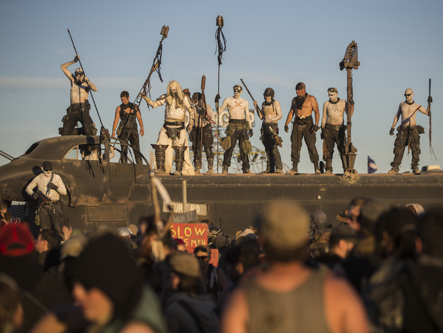 The first tribe pulls back into the gates after a vehicle cruise during the seventh annual Wasteland Weekend on Friday, Sept. 23, 2016, in California City, Calif. The four day, post-apocalyptic festival takes place in the Mojave desert and is inspired by director George Miller’s Mad Max films. Benjamin Hager/Las Vegas Review-Journal