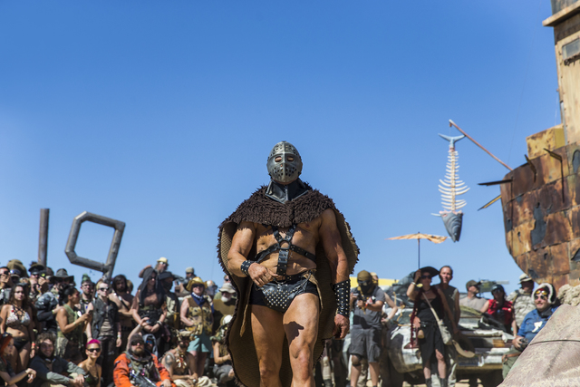 Aveloc, a champion gladiator, watches a jugger match during the seventh annual Wasteland Weekend on Saturday, Sept. 24, 2016, in California City, Calif. The four day, post-apocalyptic festival takes place in the Mojave desert and is inspired by director George Miller’s Mad Max films. Benjamin Hager/Las Vegas Review-Journal