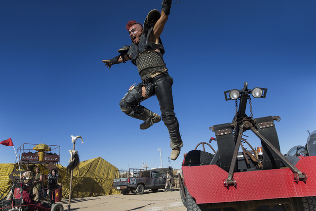 Steve Scholz leaps from his jeep during the seventh annual Wasteland Weekend on Friday, Sept. 23, 2016, in California City, Calif. The four day, post-apocalyptic festival takes place in the Mojave desert and is inspired by director George Miller’s Mad Max films. Benjamin Hager/Las Vegas Review-Journal