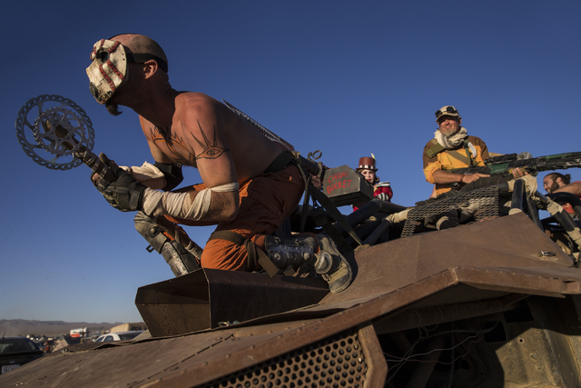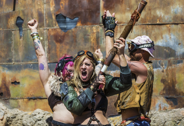 Festival goers gather at the city gates during the seventh annual Wasteland Weekend on Saturday, Sept. 24, 2016, in California City, Calif. The four day, post-apocalyptic festival takes place in the Mojave desert and is inspired by director George Miller’s Mad Max films. Benjamin Hager/Las Vegas Review-Journal
