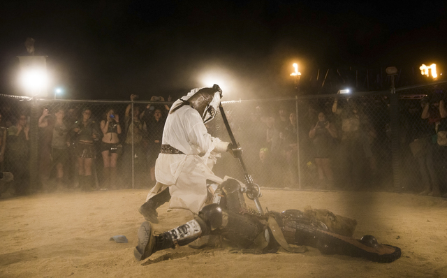 Festival goers battle in a replica of the thunderdome during the seventh annual Wasteland Weekend on Saturday, Sept. 24, 2016, in California City, Calif. The four day, post-apocalyptic festival takes place in the Mojave desert and is inspired by director George Miller’s Mad Max films. Benjamin Hager/Las Vegas Review-Journal