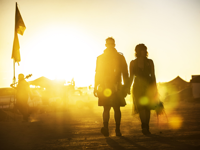 Will Gillaspy, left, and Sonia Soleno walk to a show during the seventh annual Wasteland Weekend on Saturday, Sept. 24, 2016, in California City, Calif. The four day, post-apocalyptic festival takes place in the Mojave desert and is inspired by director George Miller’s Mad Max films. Benjamin Hager/Las Vegas Review-Journal