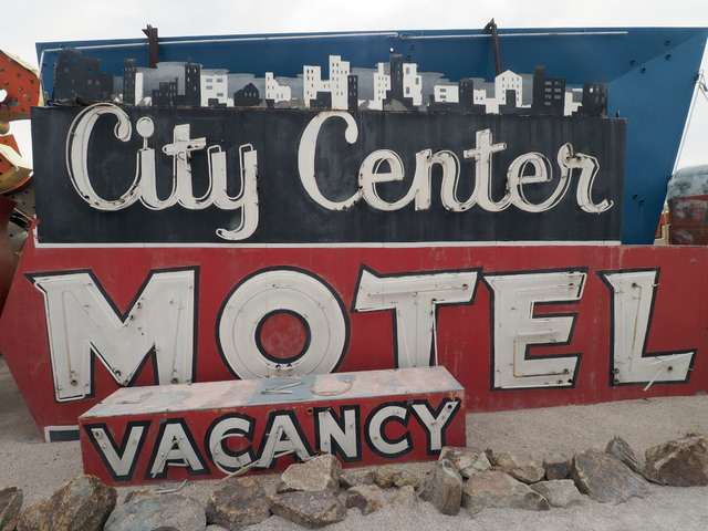 In the museum’s “Motel Row” section, Willis’ more modest, but no less imaginative, City Center Motel sign reveals two Willis trademarks: the arrow-shaped title sign and cutouts depicting a stylized urban skyline.