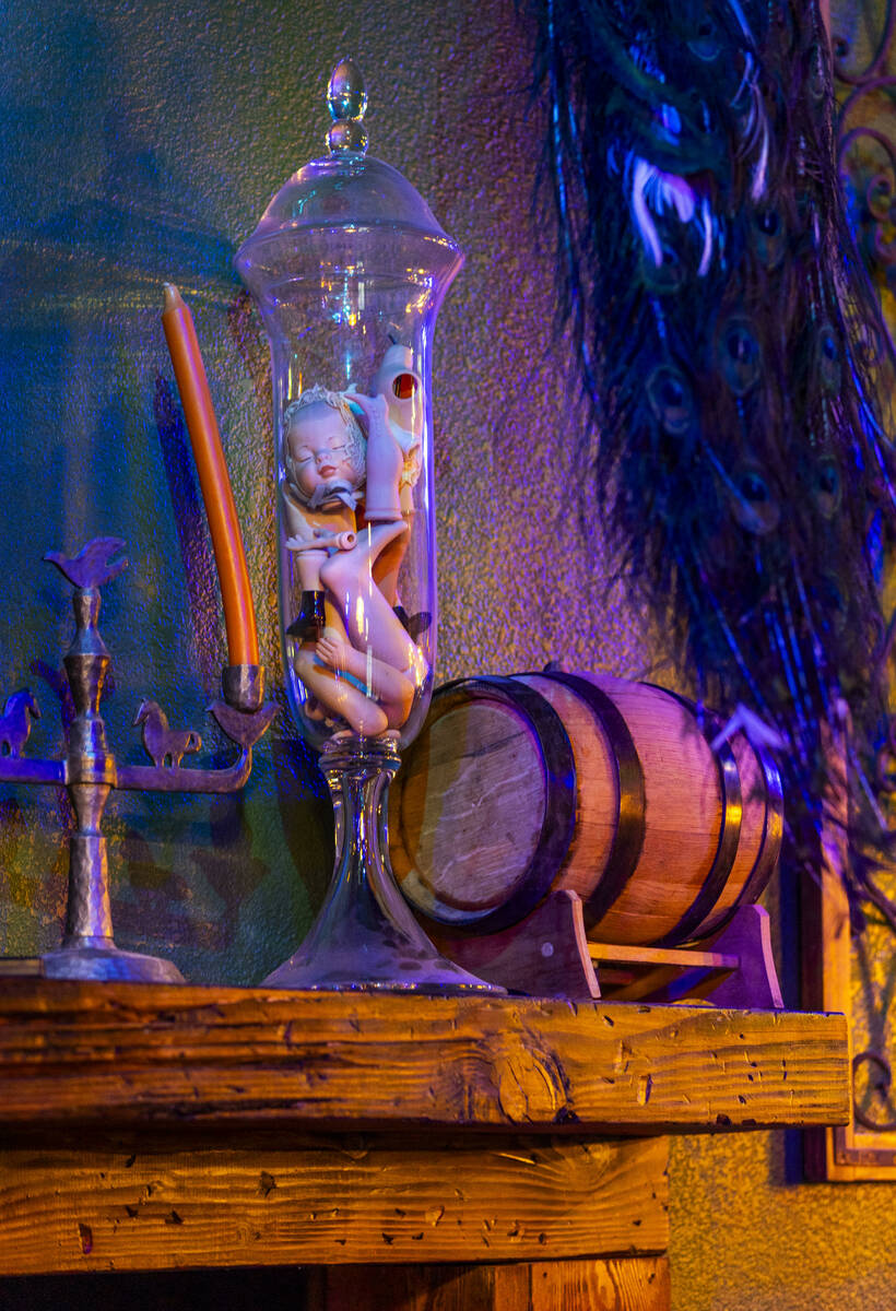 The Grey Witch’s interior design reflects its titular sorceress, who utilizes both helpful and harmful magic: The front of the place is brightly illuminated with polished wood tables for dining and is all-ages until 10 each night.